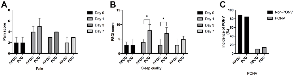 Postoperative follow-up was performed by a dedicated anesthesia nurse, and patients were divided into a POD group and a non-POD group according to whether they developed delirium after surgery. Compared with non-POD patients, POD patients had higher PSQI scores on postoperative Day 1 and postoperative Day 3 (Figure 3B). There were no differences in postoperative pain scores (Figure 3A) or incidence of nausea and vomiting (Figure 3C) between the two groups.