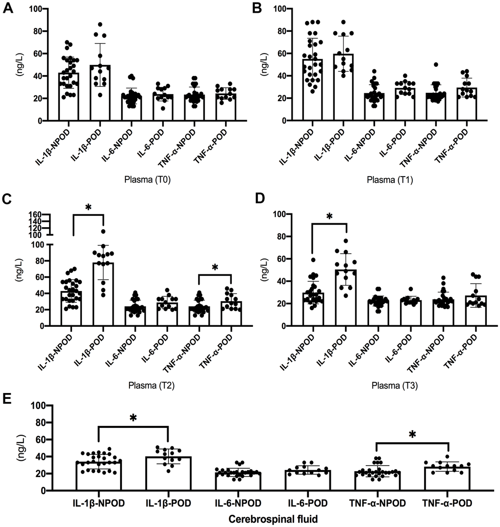 The preoperative levels of IL-1β and TNF-α in cerebrospinal fluid were higher in POD patients than in non-POD patients (Figure 4E).