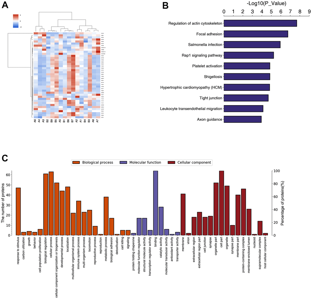 According to the screening criteria, expression difference fold greater than 1.5-fold (up- and downregulation) and P value (t test) less than 0.05, a total of nine proteins were upregulated and 55 proteins were downregulated in the peripheral blood of POD patients compared with non-POD patients (Figure 5A). KEGG pathway annotation and enrichment analysis showed that the regulation of actin cytoskeleton, and focal adhesion were highly expressed (Figure 5B). The GO annotation and enrichment analysis were performed in three aspects: biological process, molecular function, and cellular component, and the results of biological process showed that the differential proteins were concentrated in response to stimulus, biological proliferation, cellular process, cellular component organization, or biogenesis. Molecular function results showed that the differential proteins were concentrated in binding and catalytic activity. The cellular component results showed that the differentially expressed proteins were concentrated in binding and catalytic activity. The cellular component results also showed that the differentially expressed proteins were concentrated in cell parts, organelle parts, organelles, membranes, and protein-containing complexes (Figure 5C).