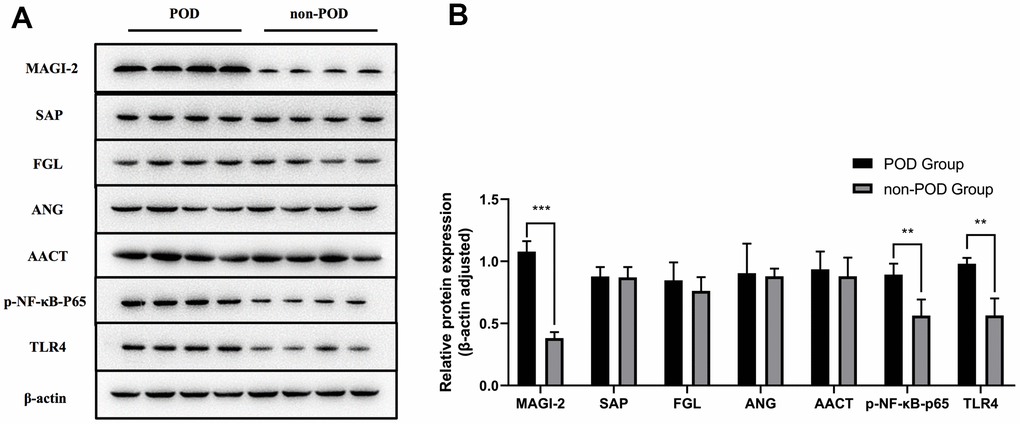 With reference to the differentially expressed proteins in proteomics and combined with the results of KEGG and GO analysis, five proteins with high expression in delirium patients were selected: MAGI-2, SAP, FGL, ANG, and AACT. After western blot validation, the expression of MAGI-2 in the peripheral blood of POD patients was significantly higher than that of non-POD patients (Figure 6A). TLR4/NF-κB pathway-related protein expression is shown in Figure 6. Compared with non-POD patients, p-NF-κB-p65 and TLR4 were highly expressed in POD patients (Figure 6B).