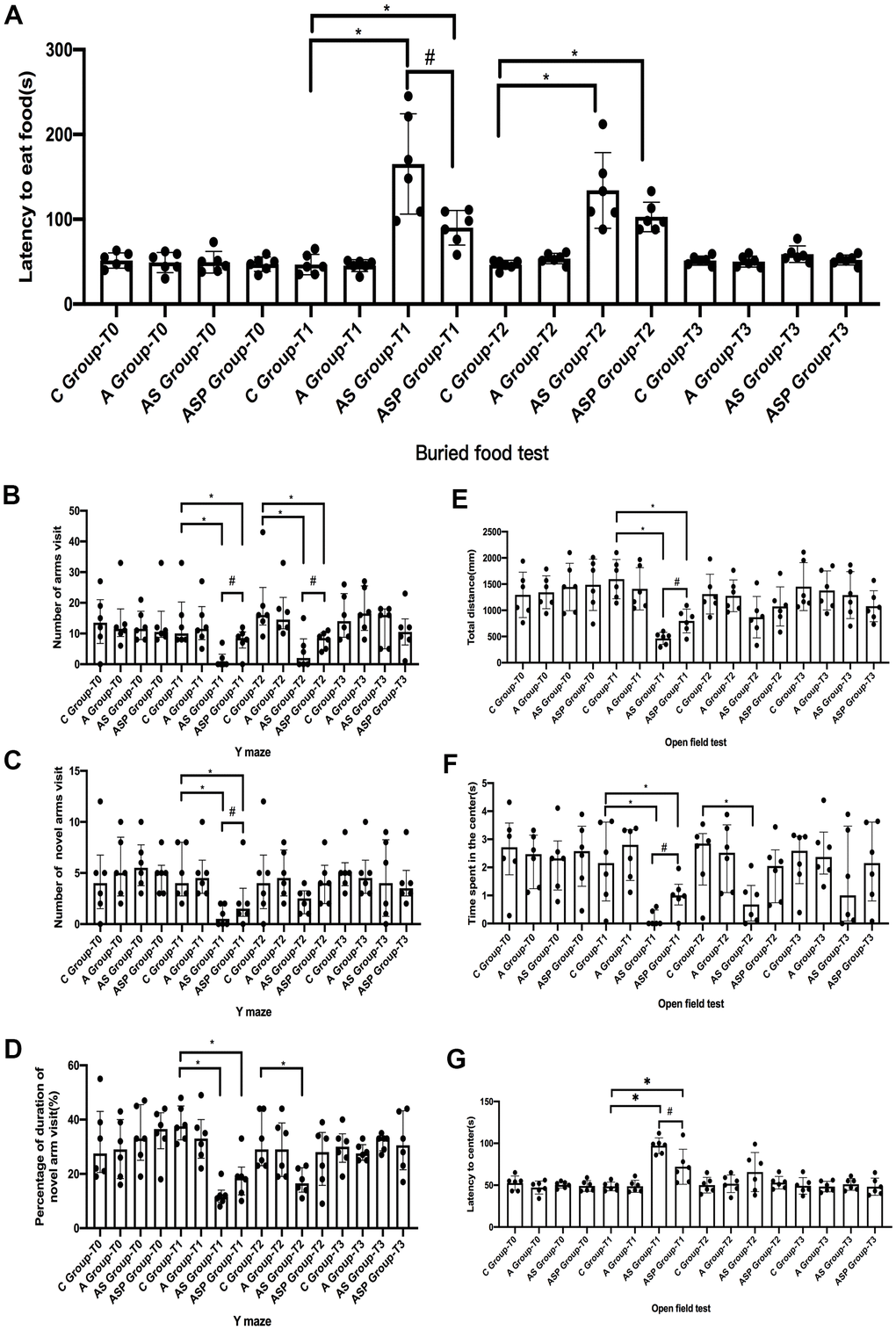 Y-maze test: There was no difference in the total number of arms visit, the percentage of duration of novel arm visit, and the number of novel arm visit for all mice before surgery. The total number, percentage of duration, and number of novel arm visits were decreased in the AS and ASP groups than in the C group at 6 h after surgery; the number of arms visit and number of novel arm visit were increased in the ASP group compared with the AS group. Compared with the C group, the number of arms visits at 9 h postoperatively was decreased in the AS and ASP groups, and the percentage of duration of novel arm visits was lower in the AS group than in the C group; the number of arms visits at 9 h postoperatively was higher in the ASP group than in the AS group (Figure 7B–7D).