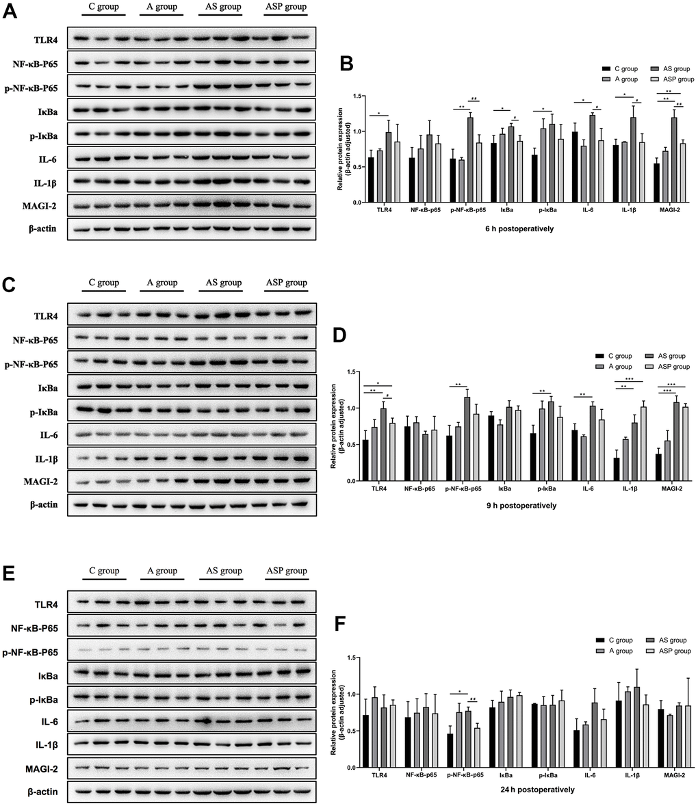 Nine hour postoperatively (Figure 8C, 8D) Compared with the C group, the expression of TLR4, p-NF-κB p65, p-IκBα, IL-6, IL-1β, and MAGI-2 was elevated in the AS group, and the expression of TLR4, IL-1β and MAGI-2 in the ASP group was higher than that in the C group; compared with the AS group, the expression of TLR4 in the ASP group was decreased (Figure 8).