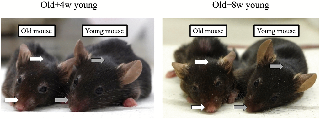The characteristic appearances of older mice not present in younger mice include sparse fur and peeling around the nose. We did not observe any improvement in these characteristics in the older mice after 2 months of parabiosis, regardless of whether they were joined with 4-week-old or 8-week-old mice (Figure 1).