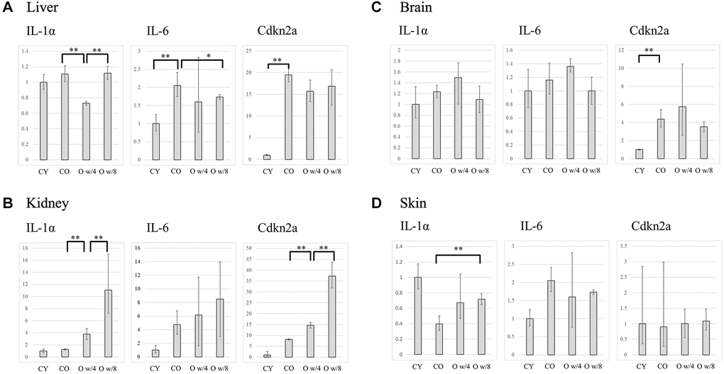 Total RNA was extracted from tissues using ISOGEN reagent (Nippon Gene Co., Ltd., Japan). Gene expression was quantified using primers against Il-6, Il-1a, and p16 and the PCR master mix (Cat. No. 4352042; Applied Biosystems, Foster City, CA, USA), according to the manufacturer’s instructions. Actb was used as the control gene for normalization. The level of gene expression in the untreated young group was used as the baseline, and fold change in gene expression was defined by the 2−ΔΔCT method.