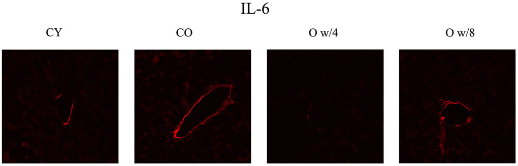 After fixation in 4% paraformaldehyde overnight, the liver sections were placed in 30% sucrose for 48 h. The frozen sections were then cut with a sliding microtome (10 μm) and stored in a cryoprotectant (OCT compound; Sakura Finetek Japan Co. Ltd., Japan) at −80oC until use. Immunostaining was performed using primary antibody against IL-6 (D5W4V, Cell Signaling Technologies, Danvers, MA, USA) and the Cy™3 AffiniPure Donkey Anti-Rabbit secondary antibody (Code: 711-165-152, Jackson ImmunoResearch Inc. West Grove, PA, USA).