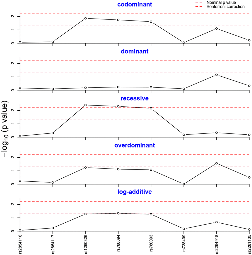 Five different genetic models (Codominant, Dominant, Recessive, Overdominant, and Log-additive) of each SNP were tested to assess their association with NAFLD further. As shown in Figure 1, the recessive model of rs1260326 was still statistically significant after Bonferroni correction. Likewise, the significant result of rs780094 survived in recessive model after Bonferroni correction. No other SNPs obtained significant differences in any genetic model.