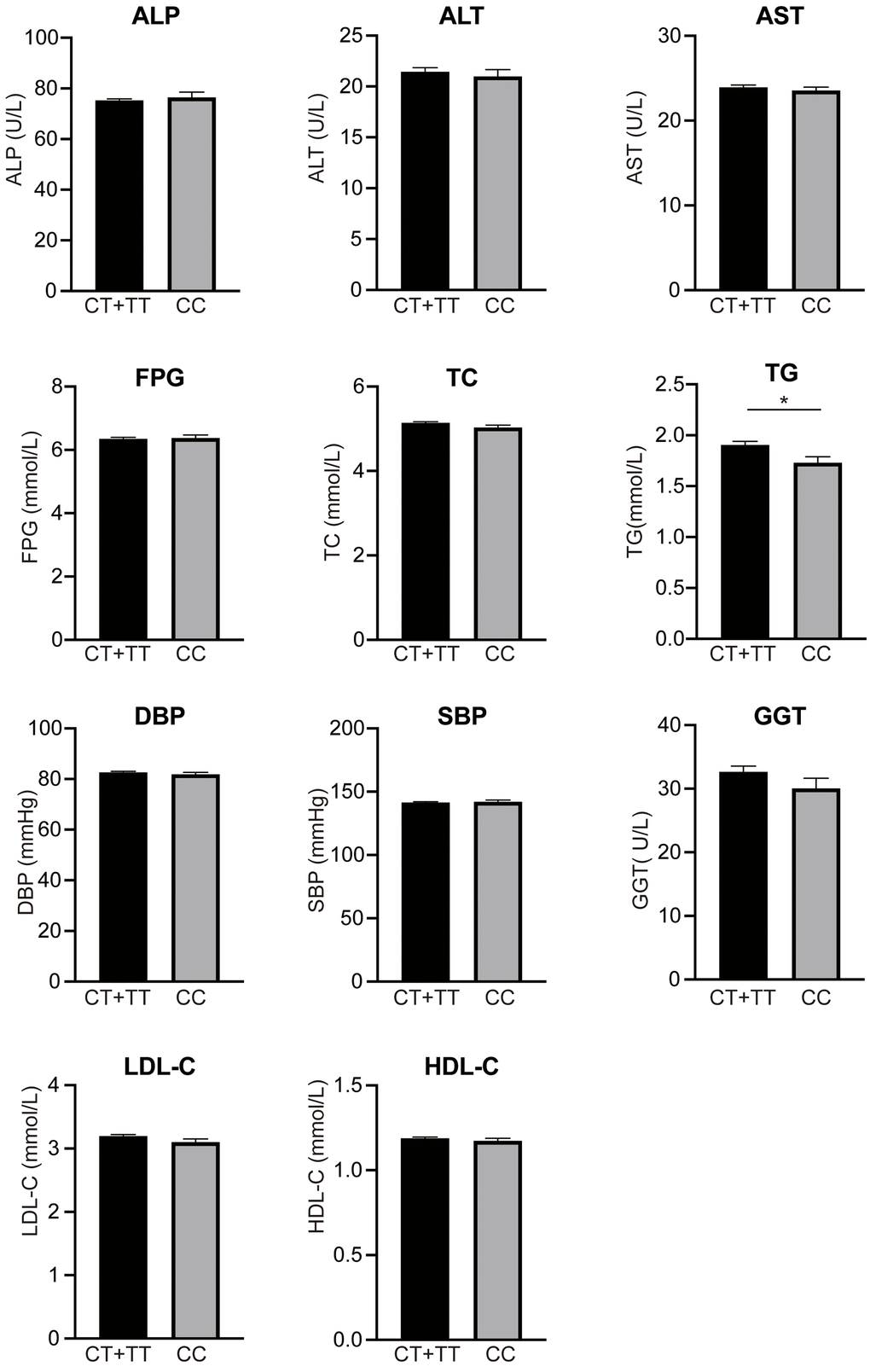 The associations between the GCKR rs1260326 variant and the hepatic enzyme, lipid, blood pressure, and FBG levels are shown in Figure 2. An increased TG level was observed in carriers of rs1260326 T allele (1.94±1.19 mmol/L) compared with non-carriers (1.73±1.05 mmol/L). However, no marked difference of other clinical parameters was observed between the carriers and non-carriers of the rs1260326 T allele (p > 0.05).