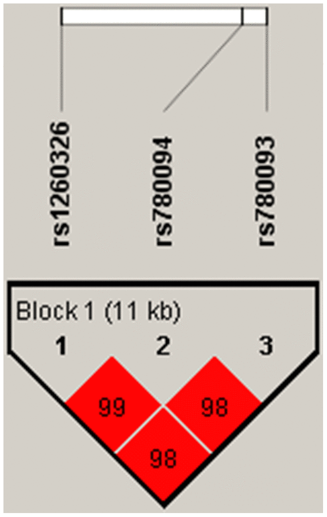 We identified rs1260326-rs780094-rs780093 as a strong LD block in the GCKR gene with Haploview analysis (Figure 4).