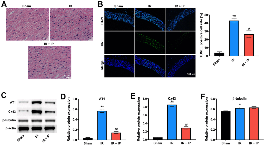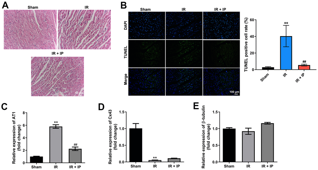Next, the effect of IP on the morphology of myocardial tissues was investigated. The results of H&E staining showed that the myocardial tissues were intact in the sham group, while the myocardial tissues were disordered with obvious fractures in the IR group. However, IP notably reversed IR induced-pathological lesions (Figure 3A). Meanwhile, IR notably induced the cell apoptosis of myocardial tissues, which was reversed by IP (Figure 3B). In addition, RT-qPCR results indicated that IR significantly increased the level of AT1 and decreased the expressions of Cx43 and β-tubulin in myocardial tissues, while these effects were all reversed by IP (Figure 3C–3E). Thus, IP could significantly protect myocardial tissues against IR injury.