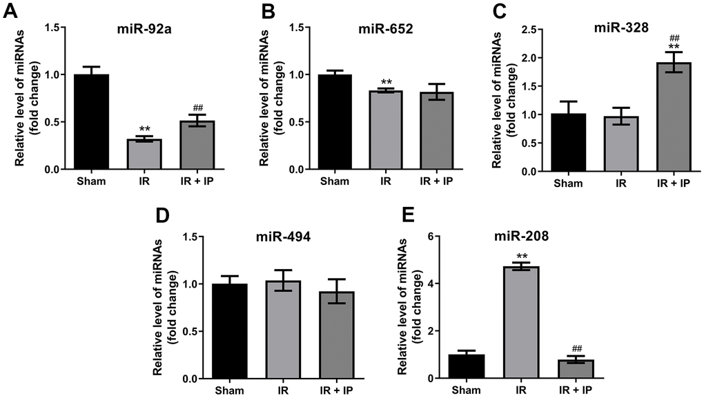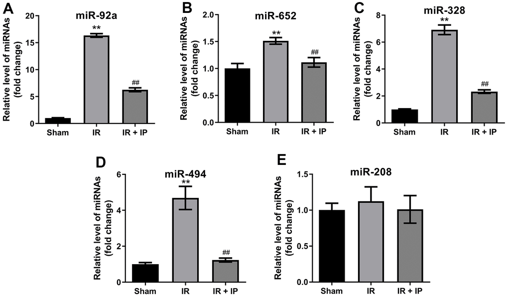 Previous studies reported that miR-92a, miR-652, miR-328, miR-494 and miR-208 are closely related to IR and non-infarction-related arterial diseases [18]. Thereby, we explored the effect of IP on these miRNAs expression in nonculprit coronary arterial tissues. RT-qPCR results showed that IR significantly promoted the expression of miR-92a, miR-652, miR-328, miR-494 and miR-208 in nonculprit coronary arterial tissues, while IP notably reversed these phenomena (Figure 2A–2E).