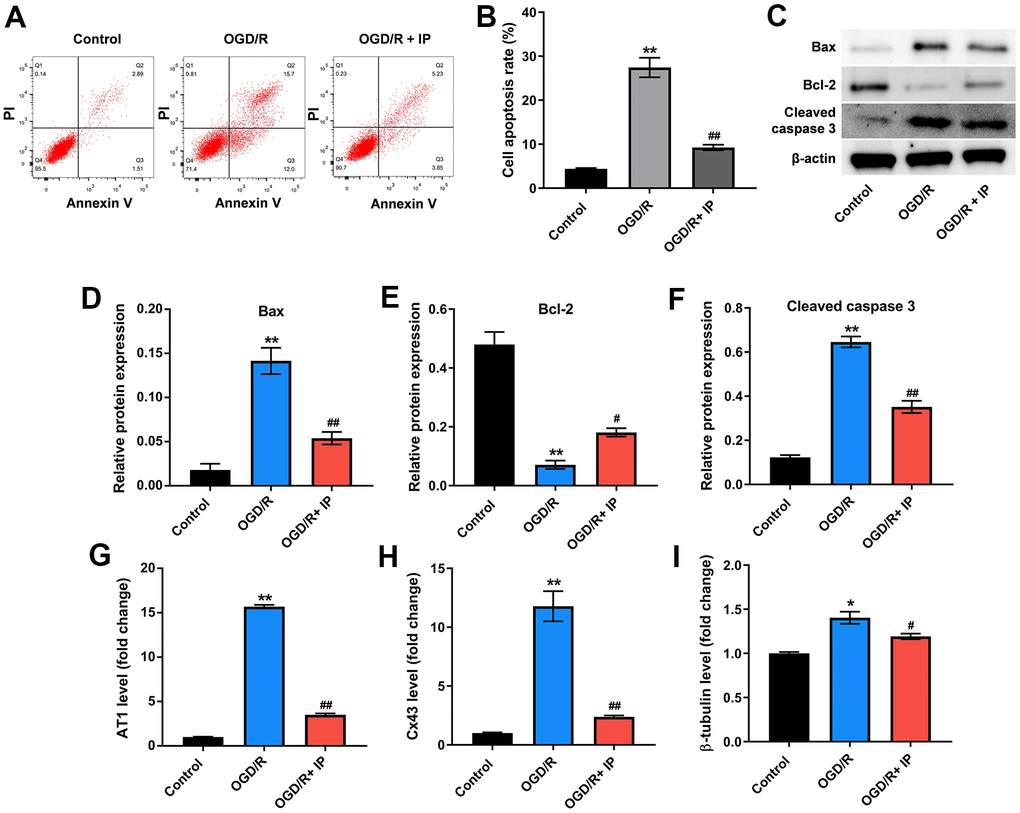Finally, to investigate the effect of IP on the apoptosis of HUVECs that were treated with OGD/R, flow cytometric analysis was performed. As shown in Figure 6A, 6B, OGD/R significantly induced the apoptosis of HUVECs, while IP markedly reversed OGD/R-induced apoptosis. Consistent with these data, western blot assay showed that OGD/R remarkably increased the level of Bax and cleaved caspase 3 and decreased the level of Bcl-2 in HUVECs, while these phenomena were all reversed by IP (Figure 6C–6F). Moreover, OGD/R largely increased the expressions of mRNA AT1, Cx43 and β-tubulin in HUVECs; however, these changes were abrogated by IP as well (Figure 6G–6I). All these data suggested that IP inhibited OGD/R-induced apoptosis of HUVECs via downregulating mRNA AT1, Cx43 and β-tubulin.