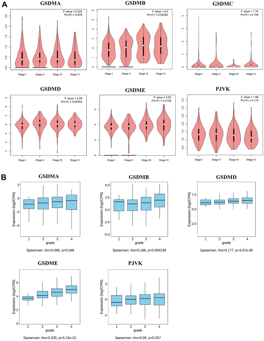 In addition, associations between GSDMs expression and clinicopathological stage and tumor grade of ccRCC were presented by GEPIA2 and TISIDB. Higher mRNA expression levels of GSDMB/D/E were related to higher tumor stage. But the mRNA expression level of PJVK was negatively related to tumor stage, and the higher the tumor stage, the lower its expression level (Figure 2A). Similarly, the mRNA expression levels of GSDMA/B/D/E were positively correlated with tumor grade (Figure 2B).