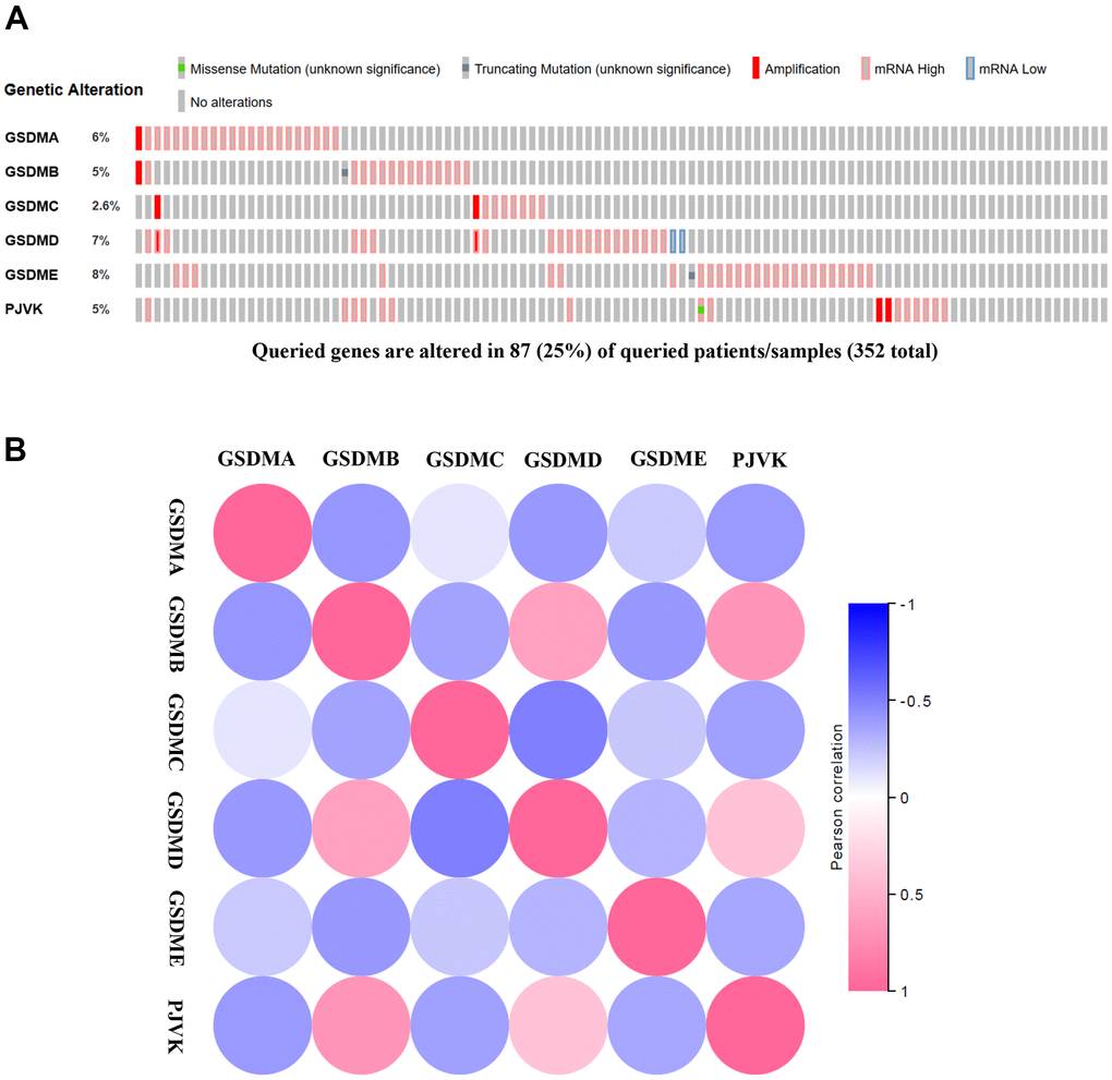 To further explore the molecular characteristics of the GSDM families that exhibit markedly differential expression, we performed a comprehensive biofunctional analysis of each of them. Differentially expressed GSDM molecules were evaluated by using the TCGA dataset. GSDMA-E and PJVK show altered expression in ccRCC, with 6%, 5%, 2.6%, 7%, 8% and 5% in the alteration rates, respectively (Figure 4A). In the GEPIA2 database, Pearson correction was used to assess the correlation between each family member. We found a strong negative association between GSDMC and GSDMD, GSDMA and GDMB, GSDMB and GSDME. GSDMB was positively correlated with PJVK and GSDMD (Figure 4B).