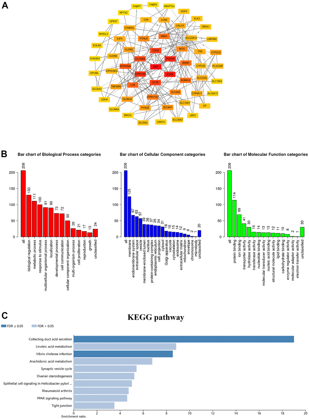 As we know, proteins interact in a variety of ways to form a complex protein-protein interaction (PPI) network that maintains cell activities. Therefore, it becomes crucial to deconstruct the structure and function of protein complexes by constructing PPI patterns. Subsequently, through the cBioPortal database we downloaded 206 differentially expressed molecules with high correlation to GSDM family members to explore the PPI patterns among them and further modified them for visualization using Cytoscape software (Supplementary Table 2). The top 60 genes were shown in Figure 5A. These results suggest that EGF, ACAN, POSTN, ATP6V1B1, CDH2, CFTR, CLCNKB, ATP6V0A4, LOX and BSND as the major molecules are associated with the functional regulation of GSDM family molecules in ccRCC. Go enrichment analysis has annotated the biological significance of differentially expressed biomarkers and their various functions in the organism. KEGG is a genome encyclopedia that used to biologically interpret the fully sequenced genome. In order to explore the biological significance and functions of the above co-expressed molecules, we performed GO annotation and KEGG pathway analysis on them using Webgestalt database. GO analysis confirmed that GSDM family molecules are mainly distributed on cell membranes and play regulatory roles in several important biological processes. Moreover, the results of molecular functional analysis showed that the main function of this family members is to act by binding to different proteins (Figure 5B). KEGG pathway analysis investigated that co-expressed genes were mainly enriched in enriched in collecting duct acid secretion, linoleic acid metabolism and vibrio cholera infection (Figure 5C).