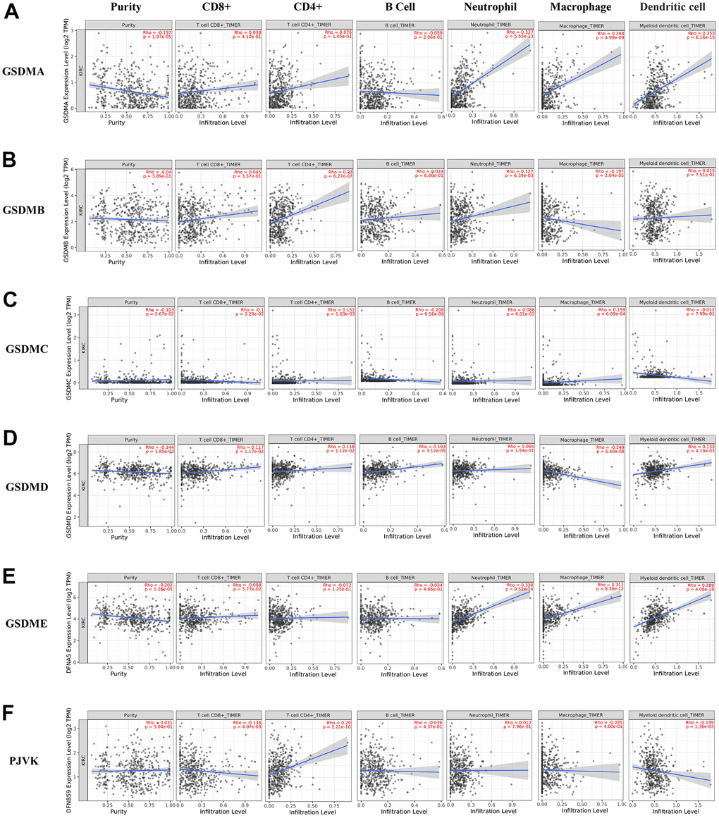 Recently, several findings have revealed that several GSDMs may be involved in inflammatory responses and immune cell infiltration in the microenvironment of a variety of cancers [18, 19]. The associations between individual GSDMs and the infiltration of different immune cells was explored using the TIMER2.0 database. Consequently, the expression of GSDMA and GSDME positively correlated with macrophage, neutrophil and dendritic cell infiltration (Figure 6A, 6E). GSDMB expression was positively related to the infiltration of CD4+ cells and neutrophils, while it was negatively related to macrophages (Figure 6B). GSDMC was negatively related to CD8 + T cells and B cells, and positively related to CD4 + T cells and macrophages (Figure 6C). GSDMD was positively correlated with CD8 + T cells, CD4 + T cells, B cells and dendritic cells, and negatively correlated with macrophages (Figure 6D). We also found that among immune infiltrated cells, the infiltration of CD4+ T cell was positively related to PJVK expression, but the infiltration of CD8+ T cell and dendritic cell was negatively correlated with it (Figure 6F). Furthermore, through the TISIDB website, we explored the role of GSDM family expression among ccRCC immune subtypes. Immune subtypes have been detailed into six types, and we found that GSDMA/B/D and GSDME showed different forms of correlation with different immune subtypes of ccRCC. For instance, GSDME showed high expression in wound healing and TGF-β dominant and low expression in immunologically quiet (Supplementary Figure 1).