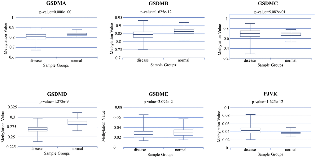 The human disease methylation database (DiseaseMeth2.0) contains not only methylation modifications data, but also annotated data on the DNA methylation status of multiple diseases [53]. We used DiseaseMeth2.0 to detect the possible methylation values of the GSDM family in ccRCC.
