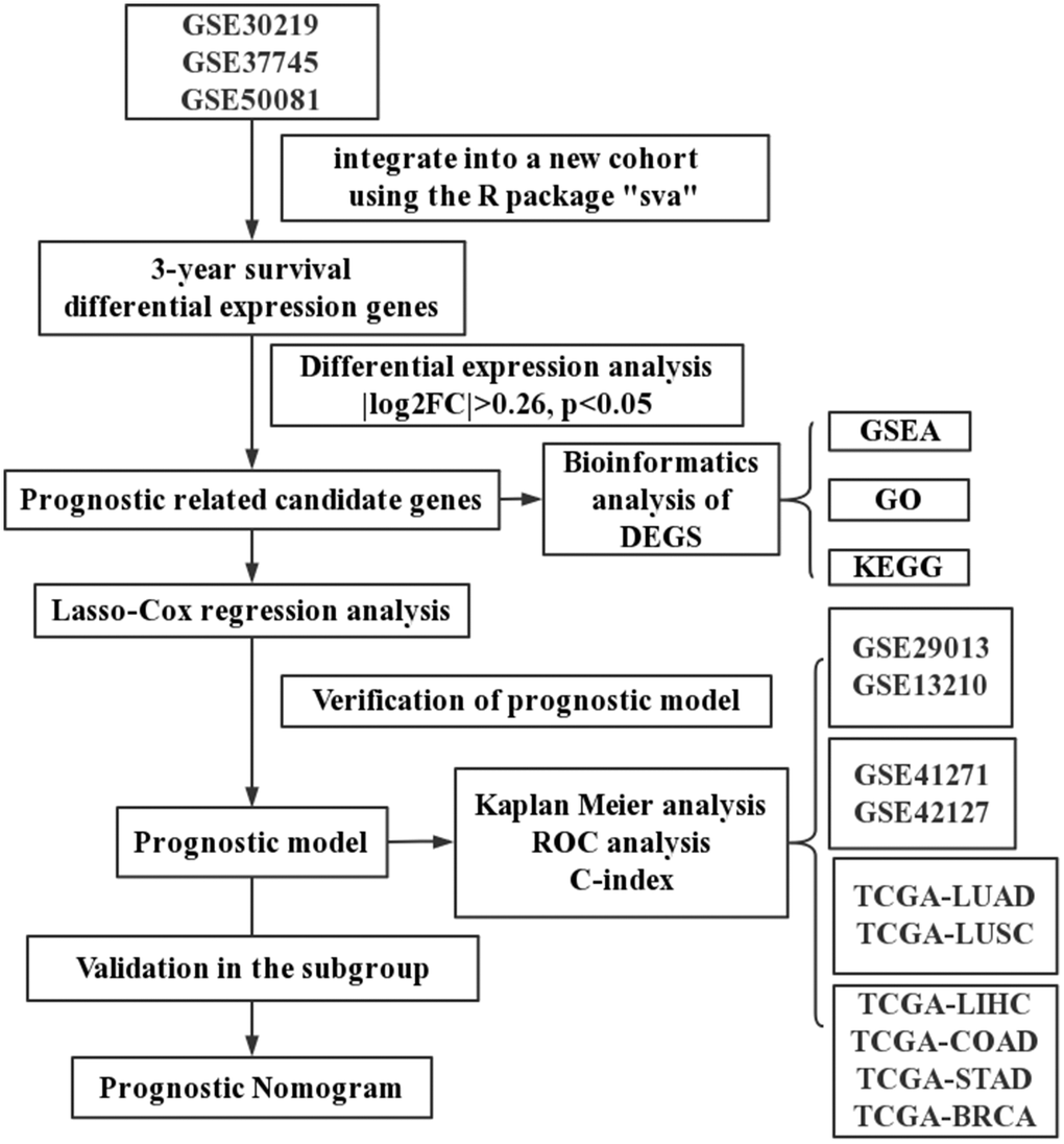 As shown in Figure 1, four sets of subjects were enrolled for preliminary and further verification of screened prognostic biomarkers. In this study, a total of 2325 lung cancer patients who had clinical and follow-up annotations were included in a training set and three validation sets. Of these, 651 patients in the training set came from GSE30219, GSE37745 and GSE50081 (Affymetrix HG-U133 Plus 2.0 Array). These microarray datasets were downloaded from the gene expression omnibus (GEO) database (http://www.ncbi.nlm.nih.gov/geo/) and normalized using a robust multichip average (RMA) algorithm. After batch effects were removed using the combined association test (COMBAT) empirical Bayes method in the surrogate variable analysis (SVA) package, these datasets containing 651 qualified lung cancer patients that were further integrated into a new cohort as the training set. Moreover, similar datasets were processed on the same platform using the identical normalization method and log2 transformation. Validation set I contained a total of 259 lung cancer patients from GSE29013 and GSE31210, and validation set II included 441 lung cancer patients from GSE41271 and GSE42127. The fragments per kilobase per million (FPKM)-normalized RNA-seq data of 494 LUAD and 480 lung squamous cell carcinoma (LUSC) patients retrieved from The Cancer Genome Atlas (TCGA) were integrated as validation set III. We excluded patients with an overall survival (OS) of less than 30 days or with a vague or absent vital status.