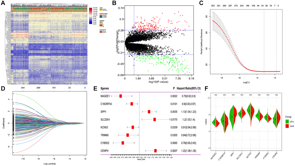 To determine the most robust prognostic indicators, LASSO-Cox regression models were used. To overcome over-fitting, tenfold cross-validation was used on the 306 DEGs associated with 3-year survival. The more robust prognostic candidates were investigated using the LASSO regression method with an optimal value of 0.1618 (Figure 2C). The results showed that all 26 prognosis-related candidates had non-zero LASSO coefficients (Figure 2D). Subsequently, multiple stepwise Cox regression was used to determine the impact of the candidate genes, and eight hub markers were chosen to construct the risk model in lung cancer patients (Table 1). The expression profiles of these eight genes showed that elevated expression of secreted phosphoprotein 1 (SPP1), sodium-dependent phosphate transporter 1 (SLC20A1), and centromere protein H (CENPH) in lung cancer samples were risk factors for prognosis. In contrast, high-expression of MAGE family member E1 (MAGEE1), chromosome 16 open reading frame 54 (C16ORF54), potassium voltage-gated channel subfamily S member 3 (KCNS3), tripartite motif containing 68 (TRIM68) and cytochrome B5 domain containing 2 (CYB5D2) were protective factors for prognosis (Figure 2E). In addition, the expression of the eight genes was significantly different between samples from alive or deceased patients with 3-year survival in lung cancer (Figure 2F). The K-M survival curve analysis revealed that the expression of these eight genes is significantly associated with lung cancer prognosis (Supplementary Figure 1).
