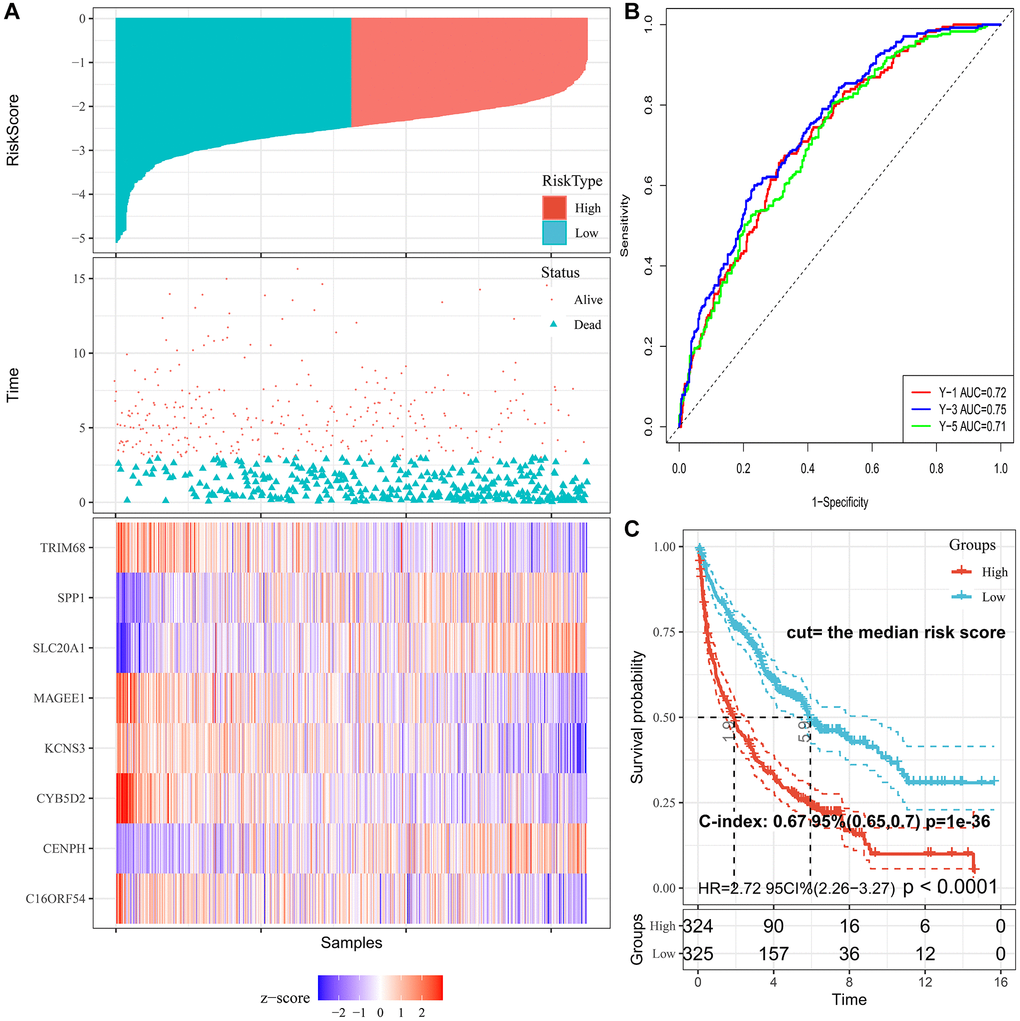 The predictive model was constructed using the eight hub markers identified using the multiple Cox regression method. The risk score of each patient was calculated based on the cox coefficients: PRS = 0.1223 × expression level of SPP1 + 0.1862 × expression level of SLC20A1 – 0.0909 × expression level of KCNS3 –0.1693 × expression level of TRIM68 – 0.2490 × expression level of CYB5D2 + 0.1954 × expression level of CENPH – 0.2869 × expression level of MAGEE1 – 0.1069 × expression level of C16ORF54.