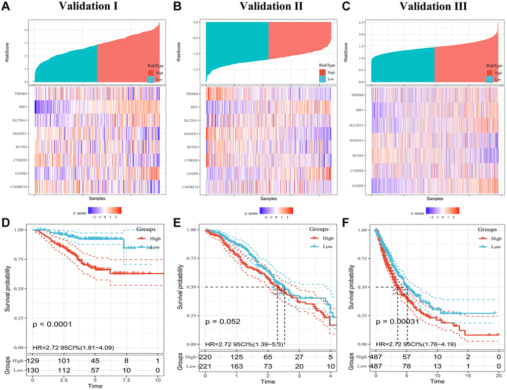 To confirm the prognostic robustness of PRS features and complex models across cohorts, we further validated it in the three independent external cohorts described earlier. Similarly, in each of the three validation sets, patients in the high-risk group had poorer outcomes, while those in the low-risk group had a higher survival rate (Figure 4A–4C). K-M analysis confirmed that the predicted high-risk group had a significantly shorter time to death (Figure 4D–4F), indicating good predictive performance of the PRS, with a HR of 2.38; 95% CI, 1.61 to 3.53 in validation set I, 1.35; 95% CI, 1.06 to 1.71 in validation set II, and 2.71; 95% CI, 1.77 to 4.18 in validation set III.