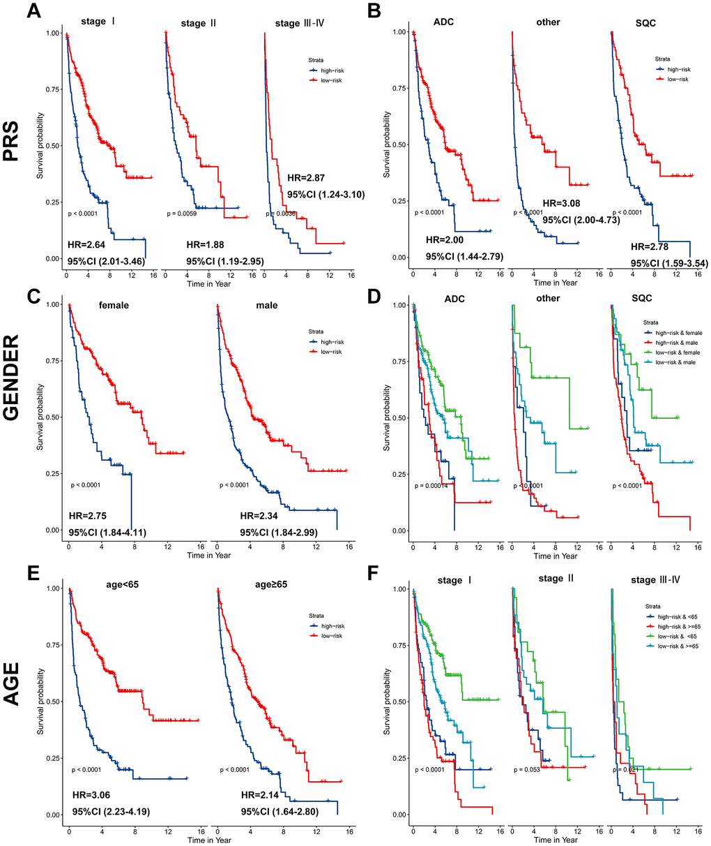 Subsequently, a stratified analysis was performed to assess whether PRS characteristics could predict the probability of patient survival in the same subgroup of clinical factors. Patients in the training cohort were classified clinically by p-stage (I/II/III-IV) (Figure 5A), histological type (glandular/squamous) (Figure 5B), gender (female/male) (Figure 5C, 5D) and age (<65/≥65) (Figure 5E, 5F). The results showed that PRS characteristics could divide patients with the same age, sex, p-stage, and histological type into high-risk and low-risk groups. In each tier, OS was shorter in patients with high-risk scores than in patients with low-risk scores (p < 0.001) (Figure 5). As a result of the above analysis, the HR does not change significantly across subgroups, and the PRS is an independent risk factor of lung cancer prognosis. It has predictive value in different people. In addition, to further prove the specificity of PRS as a prognostic factor of lung cancer in the clinic, we tested it in four other primary global cancers. The results showed that PRS signature was not associated with the prognosis of liver cancer, bowel cancer, gastric cancer, or breast cancer (Supplementary Figure 3), indicating that the PRS signature is only related to the prognosis of lung cancer.