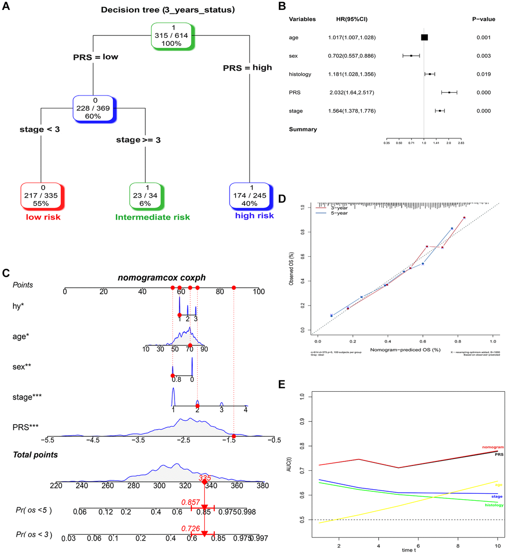 A total of 614, 259, 438, and 740 patients with full-scale five clinical annotations including age, sex (male or female), histology (LUAD, LUSC or other), p-stage (I, II, III or IV) and PRS (low or high) were extracted from the training, validation I, II, and III sets, respectively (Table 2). In the training set, multivariate Cox regression analysis revealed that these five variables were correlated with the prognosis of lung cancer, with PRS being the most significant predictor of overall survival in the Cox model (complex model) (Figure 6A). These variables were used to construct a decision tree to improve risk stratification for overall survival. As shown in Figure 6B, only p-stage and PRS remained in the decision tree, with three different risk subgroups identified. To quantify the risk assessment and survival probability for individual patients, a nomogram incorporating PRS and other clinicopathological features was constructed (Figure 6C). Furthermore, we calculated the value of each covariate of patient No. 350 (GSM1213824) and mapped it to the corresponding score, calculated the total score, and its probability at 3-year and 5-year survival. The calculated values were 0.757 and 0.881. For 3- or 5-year survival, the probability calibration plot revealed the best agreement between nomogram prediction and actual observation (45-degree dotted line) (Figure 6D), indicating that the nomogram is highly accurate. When compared to other features, the nomogram exhibited the most powerful and stable ability for survival prediction, with an average AUC greater than 0.7, significantly better than the pathological p-stage (Figure 6E).