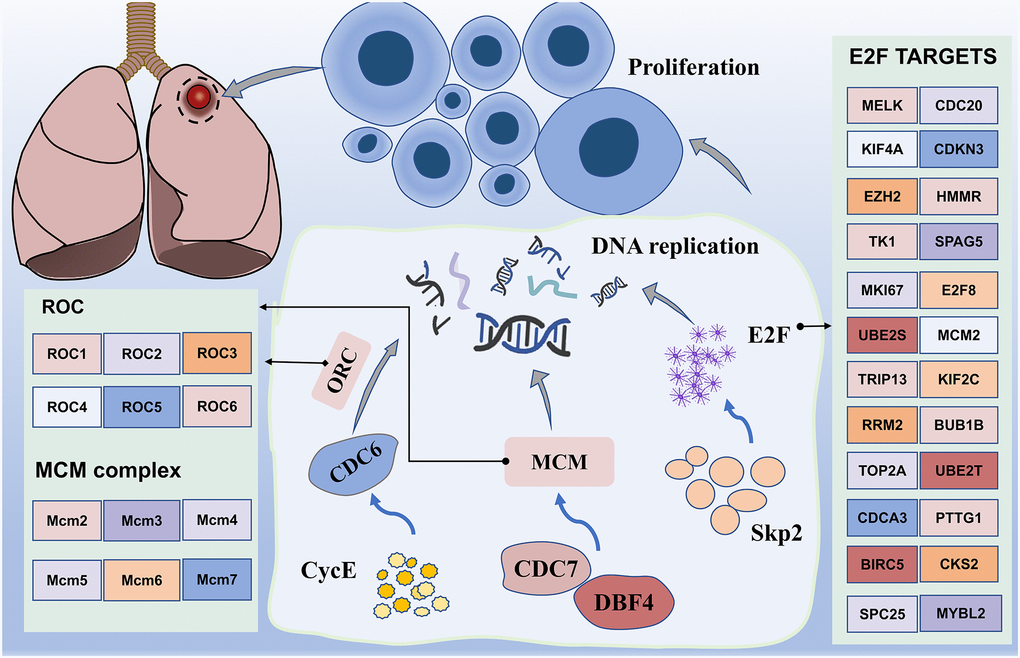 In addition, we note the enrichment results, which mainly include the cell cycle. Interestingly, the GSEA results from the hallmark gene sets were also enriched for genes encoding cell cycle-related targets of the E2F transcription factor. Our data uncovered differential expression of multiple genes, including CDC6, CDC7, DBF4, MCM and CycE (Figure 8). Most of them may induce SQLC through DNA replication and cell cycle pathway [48]. Minichromosome maintenance complex component 4 (MCM4), a highly expressed gene in NSCLC, is required for the proliferation of NSCLC cells [49]. MCM proteins, including MCM2-7, are also required for replication initiation and elongation [50]. In addition, Skp2 activated PI3K/AKT pathway activities by upregulating the transcription activity of E2F, thereby potentially promoting the occurrence of lung cancer [51]. These results suggest that the transcriptional regulation through E2F may be a novel therapeutic target in lung cancer.
