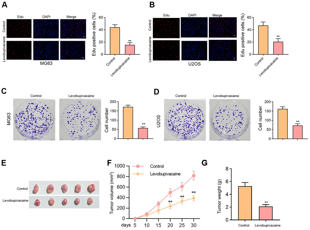 We initially assessed the effect of levobupivacaine on osteosarcoma cell proliferation. Our data showed that the treatment of levobupivacaine suppressed numbers of Edu-positive MG63 and U2OS cells (Figure 1A, 1B). Meanwhile, the colony numbers of MG63 and U2OS cells were repressed by levobupivacaine (Figure 1C, 1D). The tumor xenograft analysis showed that levobupivacaine significantly repressed the MG63 cell growth in the nude mice (Figure 1E–1G).
