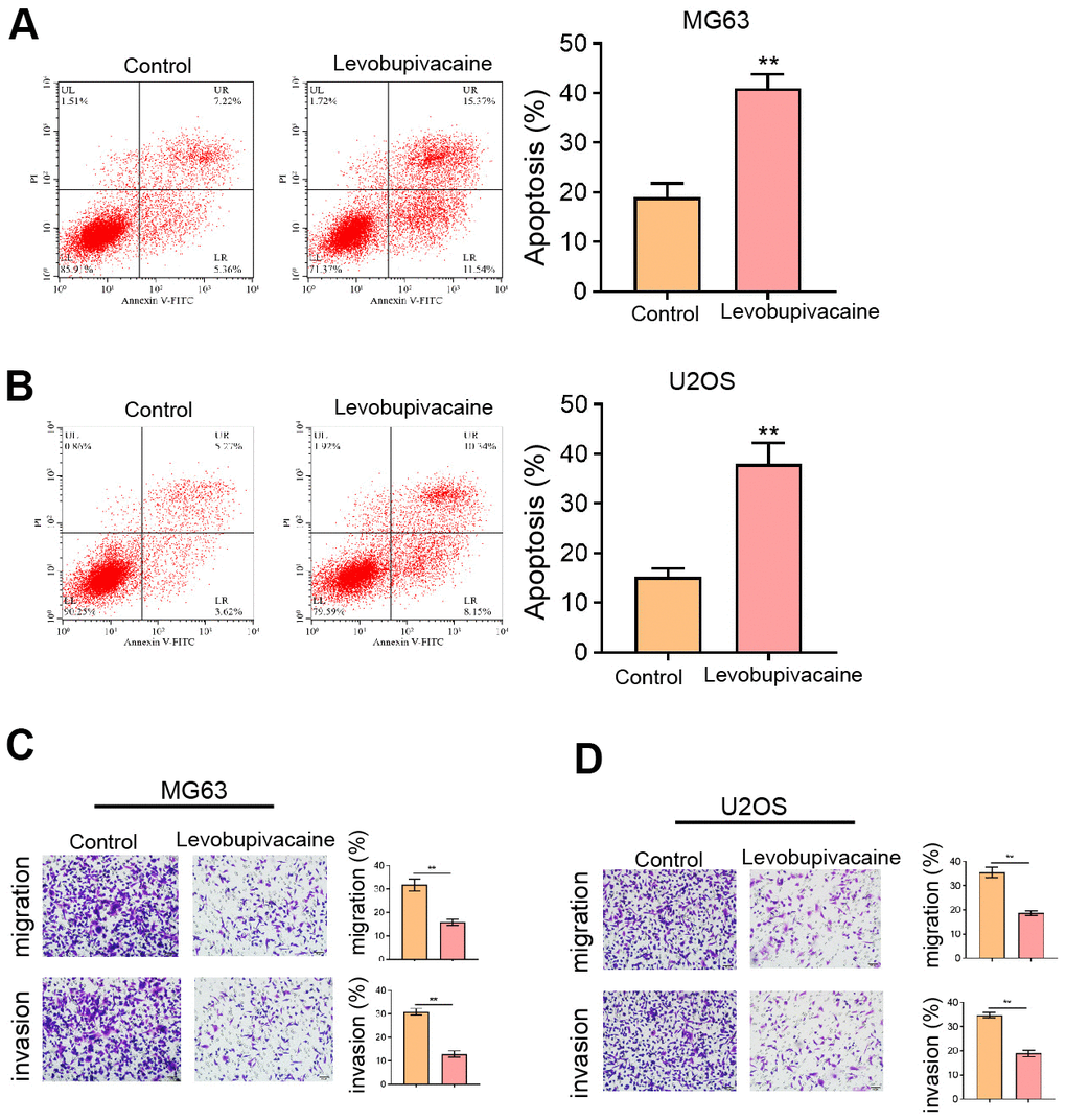 Moreover, we found that the treatment of levobupivacaine improved the apoptosis rate of MG63 and U2OS cells (Figure 2A, 2B). The invasion and migration abilities of MG63 and U2OS cells were attenuated by levobupivacaine as well (Figure 2C, 2D).