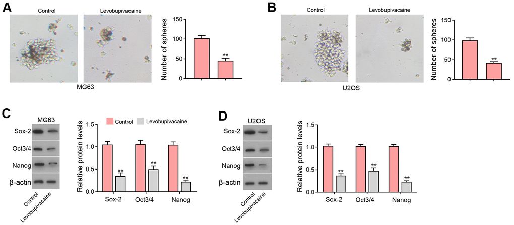 Furthermore, we observed that the sphere formation capabilities of MG63 and U2OS cells were repressed by levobupivacaine (Figure 3A, 3B). The protein levels of Sox-2, Oct3/4, and Nanog were inhibited by the treatment of levobupivacaine in MG63 and U2OS cells (Figure 3C, 3D).