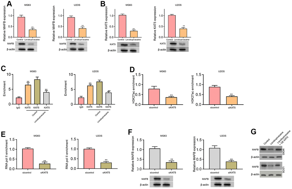 Next, we identified that the treatment of levobupivacaine inhibited MAFB and KAT5 expression in MG63 and U2OS cells (Figure 4A, 4B). We observed that KAT5 could enriched in the promoter region of MAFB in MG63 and U2OS cells, while levobupivacaine treatment could repressed the enrichment (Figure 4C). The effectiveness of KAT5 depletion by siRNA was validated in the cells (Supplementary Figure 1A, 1B). Meanwhile, the suppression of KAT5 by siRNA repressed the enrichment of histone H3 acetylation at lysine 27 (H3K27ac) on promoter of MAFB (Figure 4D). Consistently, the enrichment of RNA polymerase II on promoter of MAFB was reduced by the depletion of KAT5 in MG63 and U2OS cells (Figure 4E). The expression of MAFB was decreased by KAT5 knockdown in MG63 and U2OS cells (Figure 4F). Moreover, the expression of MAFB was repressed by levobupivacaine, while the overexpression of KAT5 could reverse the repression of MAFB in MG63 and U2OS cells (Figure 4G). Moreover, we validated that the expression of MAFB and KAT5 was enhanced in clinical osteosarcoma tissues and the expression of MAFB was positively correlated with KAT5 in the tissues (Supplementary Figure 2).
