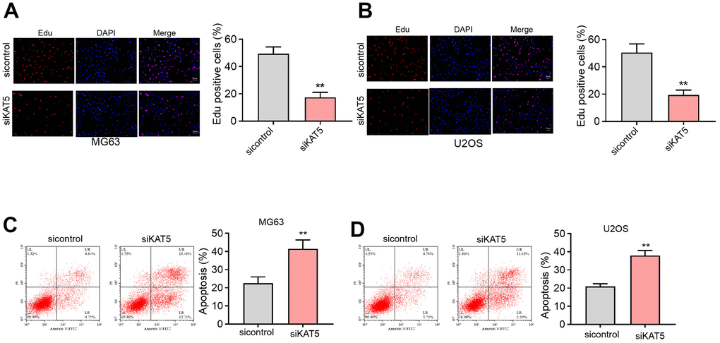 We then identified that the suppression of KAT5 by siRNA was able to attenuate the counts of Edu-positive MG63 and U2OS cells (Figure 5A, 5B). Meanwhile, the cell apoptosis of MG63 and U2OS cells was induced by the depletion of KAT5 as well (Figure 5C, 5D).