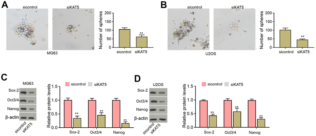 Moreover, we found that the sphere formation abilities of MG63 and U2OS cells were inhibited by the depletion of KAT5 (Figure 6A, 6B). The protein levels of Sox-2, Oct3/4, and Nanog were repressed by the inhibition of KAT5 in MG63 and U2OS cells (Figure 6C, 6D).