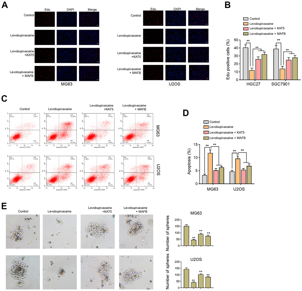 The effectiveness of KAT5 overexpression was validated in the cells (Supplementary Figure 1B). Next, our data demonstrated that the Edu-positive MG63 and U2OS cells were decreased by the treatment of levobupivacaine and the overexpression of KAT5 or MAFB could rescued the phenotype (Figure 7A, 7B). Levobupivacaine enhanced apoptosis rate of MG63 and U2OS cells, in which KAT5 or MAFB overexpression reversed apoptosis (Figure 7C, 7D). The sphere formation abilities inhibited by levobupivacaine could be rescued by the overexpression of KAT5 or MAFB (Figure 7E).