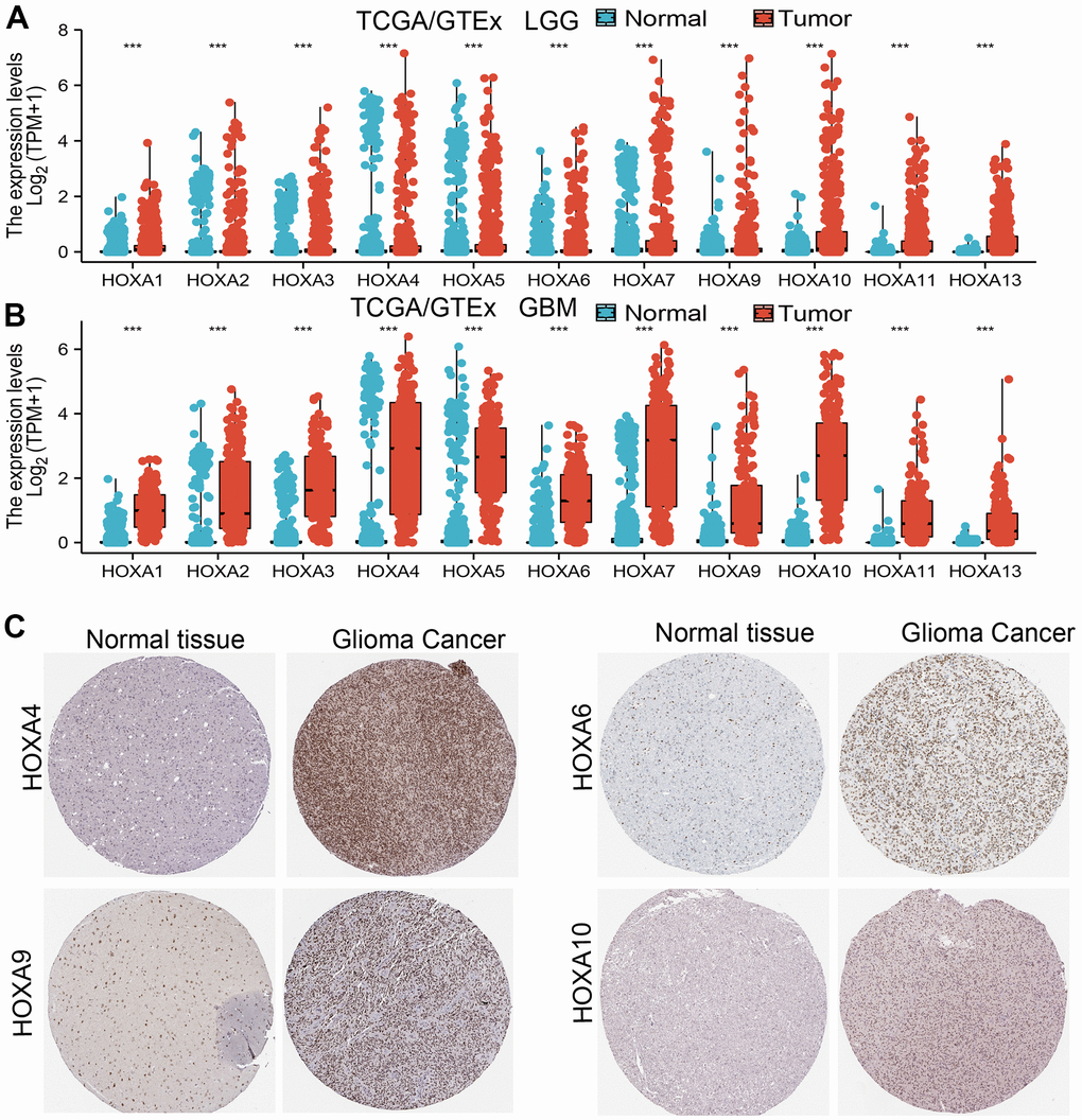 Previous studies reported that HOXA genes differentially expressed in various cancers. For instance, it was found that HOXA7 and HOXA9 mRNAs were elevated in esophageal squamous cell carcinoma tissues [27]. On the contrary, HOXA9 was decreased in NSCLC [28]. HOXA13 expression was up-regulated in in breast cancer [28], whereas it was down-regulated in colorectal cancer [29]. However, the expression pattern of the HOXA gene family in LGG was not previously comprehensively investigated. In our finding, we found that 11 HOXAs were significantly higher in LGG and GBM than normal samples. Furthermore, we uncover that the protein of HOXA4, HOXA6, HOXA9 and HOXA10 were highly expressed in LGG tissue compared with control group based on the Human Protein Atlas datasets.