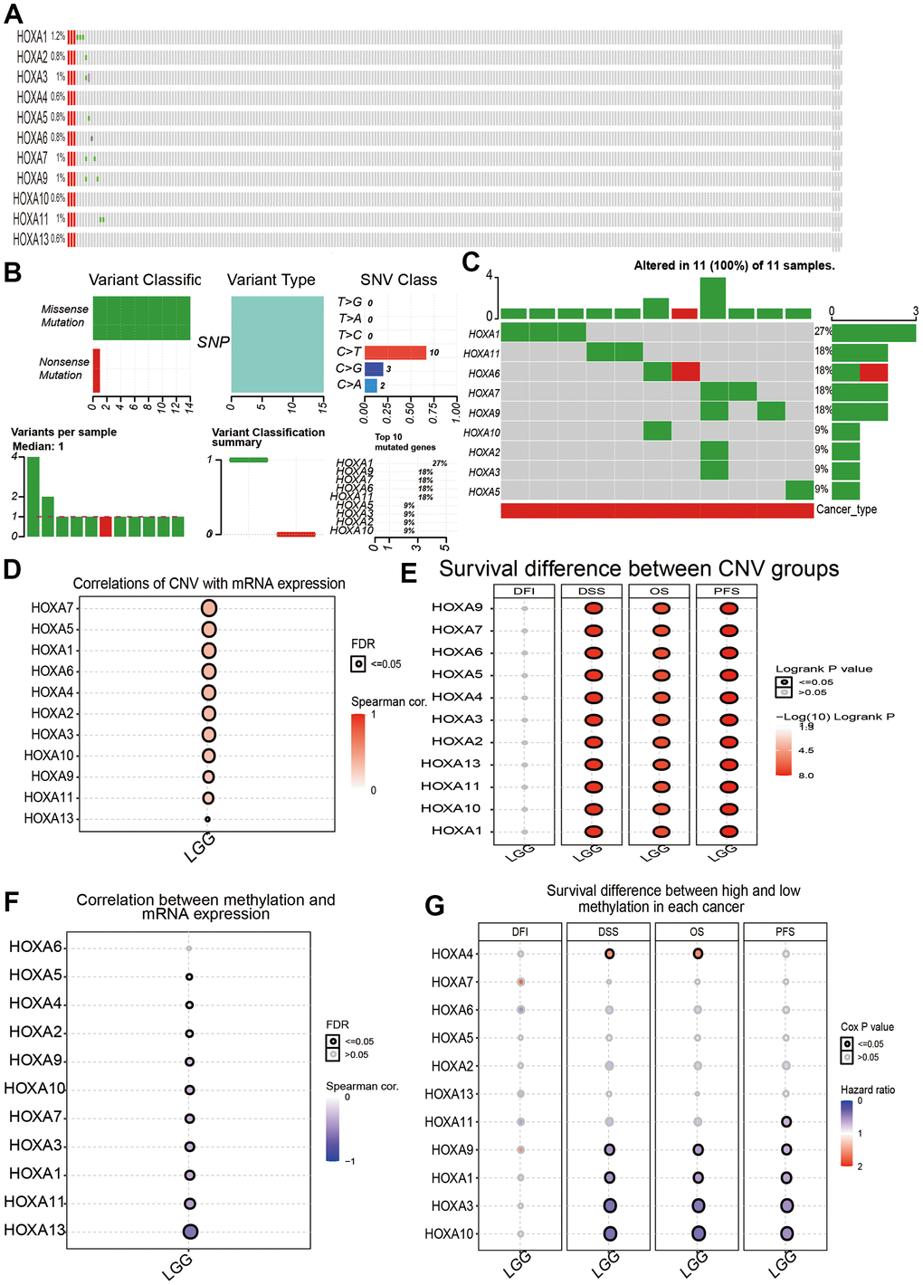 We also analysis the landscape of genetic variation of HOXAs in LGG, the results confirmed that HOXA1, HOXA2, HOXA3, HOXA4, HOXA5, HOXA6, HOXA7, HOXA9, HOXA10, HOXA11 and HOXA13 were all altered, with 1.2, 0.8, 1, 0.6, 0.8, 0.8, 1, 1, 0.6, 1 and 0.6alterations in the LGG samples, respectively. We also uncover that missense mutation was the most common variant classification, SNPs were the most common variant type and C > T ranked as the top SNV class. The results also showed HOXA1 as the gene with the highest mutation frequency, followed by HOXA11 and HOXA6, among the 11 HOXAs. CNV analysis results confirmed that copy number variations of HOXAs was significantly positive correlated with its expression in LGG. Furthermore, HOXAs CNV affect the overall survival (OS), disease-specific survival (DSS) and progression-free survival (PFS) in LGG patients. Finally, we uncover that the DNA methylation level of HOXA13 negatively associated with its expression. More importantly, lower DNA methylation level of HOXA1, HOXA3, HOXA9 and HOXA10 were correlated with poor DSS, OS and PFS.