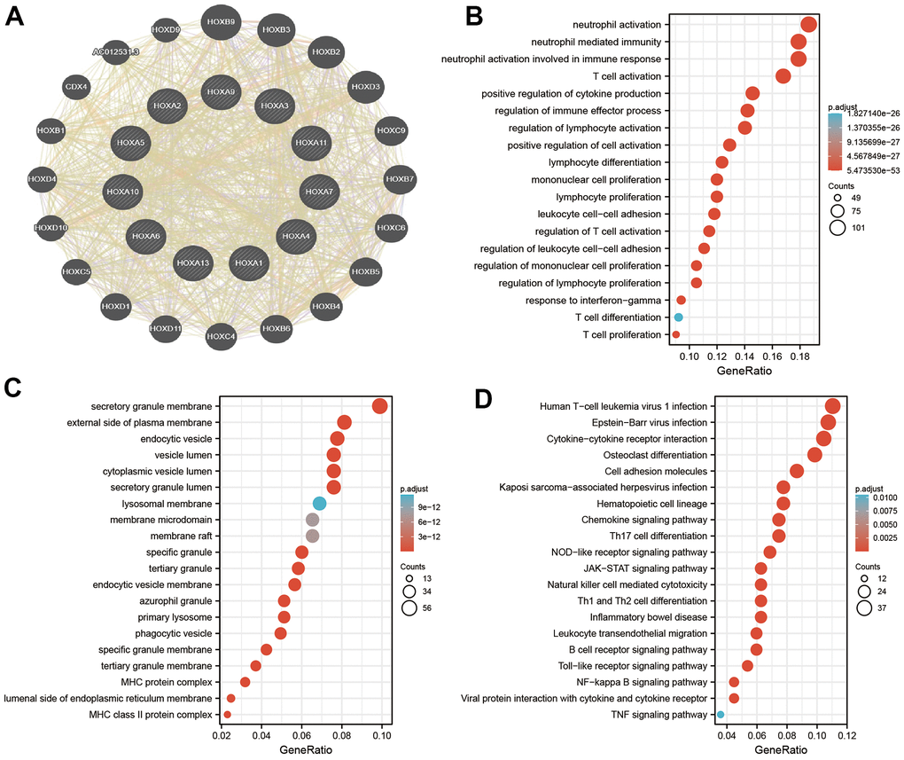 To explore the potential functions of HOXAs in LGG progression, we were using the GeneMANIA database constructed the gene-gene interaction network for HOXAs and the altered neighboring genes (Figure 11A). Furthermore, we perform the GO and KEGG enrichment to explore the functions of HOXAs and their neighboring genes in LGG. The enrichment results confirmed that the biological processes for these genes were mostly neutrophil activation, neutrophil mediated immunity, neutrophil activation involved in immune response, T cell activation, positive regulation of cytokine production, regulation of immune effector process, regulation of lymphocyte activation, positive regulation of cell activation, lymphocyte differentiation, mononuclear cell proliferation, lymphocyte proliferation, leukocyte cell−cell adhesion, regulation of T cell activation, regulation of leukocyte cell−cell adhesion, regulation of mononuclear cell proliferation, regulation of lymphocyte proliferation, response to interferon−gamma, T cell differentiation and T cell proliferation (Figure 11B). The molecular functions for these genes were mostly secretory granule membrane, external side of plasma membrane, lysosomal membrane, membrane microdomain, phagocytic vesicle, specific granule membrane, MHC protein complex and MHC class II protein complex (Figure 11C). KEGG enrichment results confirmed that these genes mainly involved in the Cytokine−cytokine receptor interaction, Osteoclast differentiation, Cell adhesion molecules, Kaposi sarcoma−associated herpes, virus infection, Hematopoietic cell lineage, Chemokine signaling pathway, Th17 cell differentiation, NOD−like receptor signaling pathway, JAK−STAT signaling pathway, Natural killer cell mediated cytotoxicity, Th1 and Th2 cell differentiation, Inflammatory bowel disease, Leukocyte transendothelial migration, B cell receptor signaling pathway, Toll−like receptor signaling pathway, NF−kappa B signaling pathway, Viral protein interaction with cytokine and cytokine receptor and TNF signaling pathway (Figure 11D). Collectively, these data suggest that HOXAs plays an essential regulatory role in the inflammation response and immune regulation.