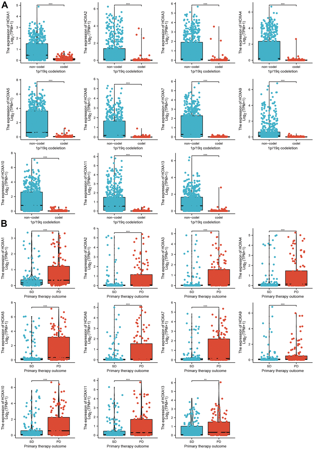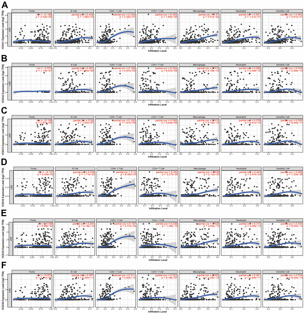 Previous studies showed that the immune infiltration of CD4+ T cells and CD8+ T cells were significantly affected the prognosis of LGG [34]. In this finding, we found that somatic copy number alterations of HOXAs were significantly correlated with diverse immune cell infiltration levels in LGG. Furthermore, we confirm that HOXAs were positively correlated with the immune infiltration of B cells, CD4+ T cells, CD8+ T cells, Neutrophils, Macrophages and Dendritic cells in LGG. More importantly, we uncover that HOXAs expression was significantly positively correlated with CD274, CTLA4, HAVCR2, LAG3, PDCD1, PDCD1LG12 and SIGLEC15. Thus, this research provides new insights into understanding the potential roles of HOXAs in immune cell infiltration of LGG and its potential use as cancer therapeutic and prognostic biomarker.