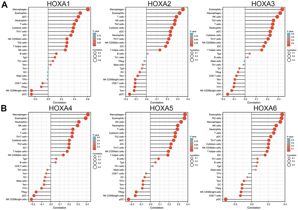 Finally, ssGSEA with Spearman’s rank correlation was employed to measure the correlation between HOXAs expression and infiltration levels of 24 immune cell types in glioma. The results showed that HOXA1 expression was correlated with the immune infiltration of macrophages and eosinophils, negatively correlated with the immune infiltration of NK CD56bright cells and pDC. HOXA2 positively correlated with the immune infiltration of Macrophages, Eosinophils and T cells, negatively correlated with the immune infiltration of Tcm and pDC. HOXA3 positively correlated with the immune infiltration of NK cells, Th2 cells and T cells, negatively correlated with the immune infiltration of NK CD56bright cells and pDC. HOXA4 positively correlated with the immune infiltration of macrophages, eosinophils and neutrophils, negatively correlated with the immune infiltration of pDC and NK CD56bright cells. HOXA5 positively correlated with the immune infiltration of Macrophages, Eosinophils, NK cells and Neutrophils, negatively correlated with the immune infiltration of NK CD56bright cells and pDC. HOXA6 positively correlated with the immune infiltration of Eosinophils, Th2 cells and Macrophages, negatively correlated with the immune infiltration of CD8 T cells and pDC. HOXA7 positively correlated with the immune infiltration of Th2 cells, neutrophils and NK cells, negatively correlated with the immune infiltration of NK CD56bright cells and pDC. HOXA9 positively correlated with the immune infiltration of Neutrophils and Eosinophils, negatively correlated with the immune infiltration of NK CD56bright cells and TReg. Furthermore, HOXA10 expression associated with the immune infiltration of several subsets of myeloid cells, including macrophages, Eosinophils and Neutrophils, HOXA10 expression negatively correlated with the immune infiltration of TReg and NK CD56bright cells. There are positive correlations between HOXA11 expression and the immune infiltration of Macrophages, T helper cells and Neutrophils, negatively correlated with the immune infiltration of TRegNK CD56bright cells. There is also a strong positive correlation between HOXA13 expression and immune infiltration of Tgd, T helper cells and Macrophages, negatively correlated with the immune infiltration of TReg and NK CD56bright cells (Figure 13 and Supplementary Figure 9). Taken together, these results confirmed that HOXAs plays a pivotal role in the immune regulation.