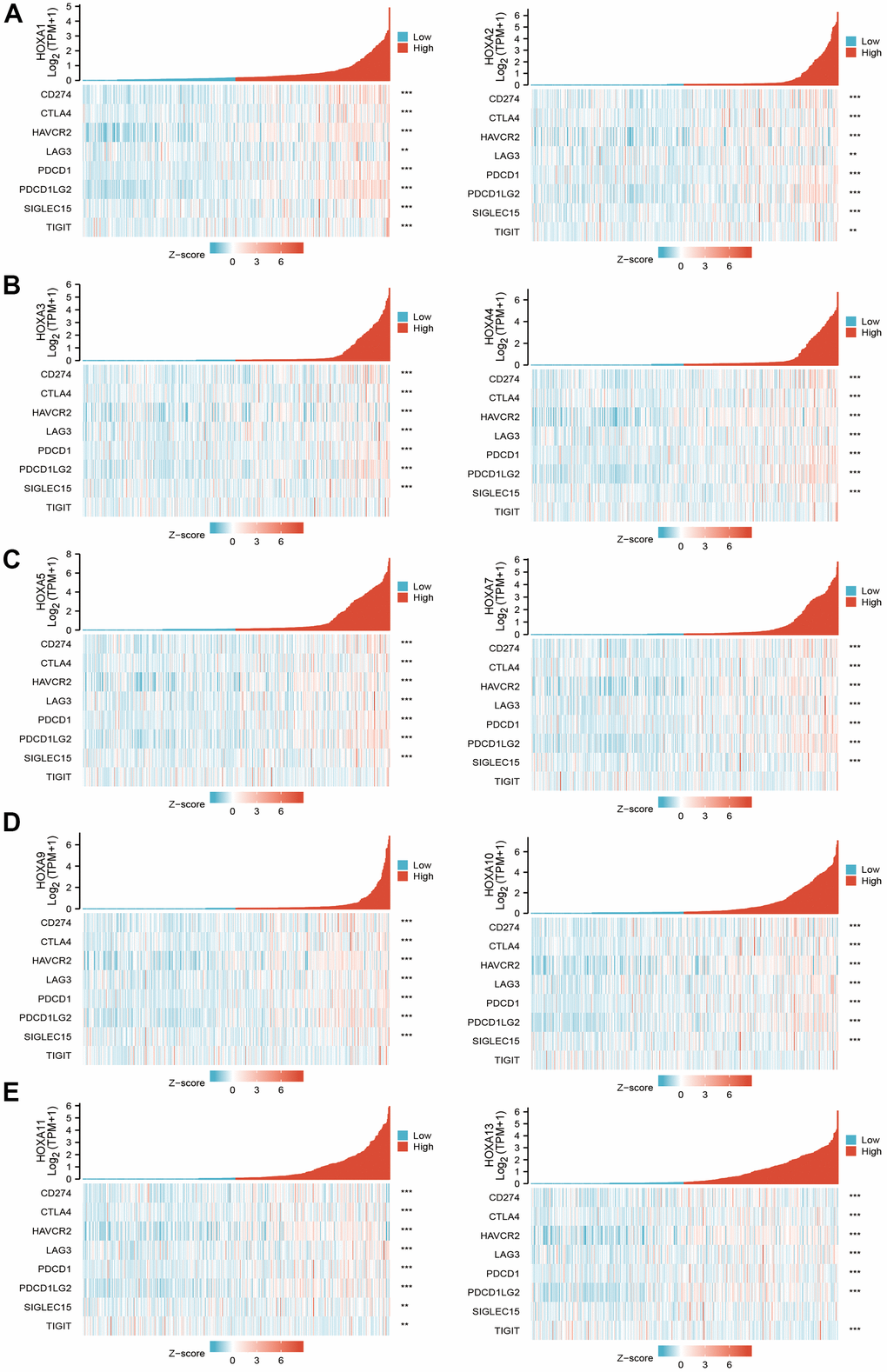 Considering immune modulator plays a crucial role in the immune response and development and progression of LGG. We explored the correlation between HOXAs and the immune checkpoint-related genes by using Pearson correlation analysis in LGG, including CD274, CTLA4, HAVCR2, LAG3, PDCD1, PDCD1LG12, TIGIT, SIGLEC15. The result showed that HOXAs expression was significantly positively correlated with CD274, CTLA4, HAVCR2, LAG3, PDCD1, PDCD1LG12 and SIGLEC15 (Figure 14). These results demonstrate that HOXAs expression was significantly correlated with the expression of immune checkpoint-related genes in LGG.