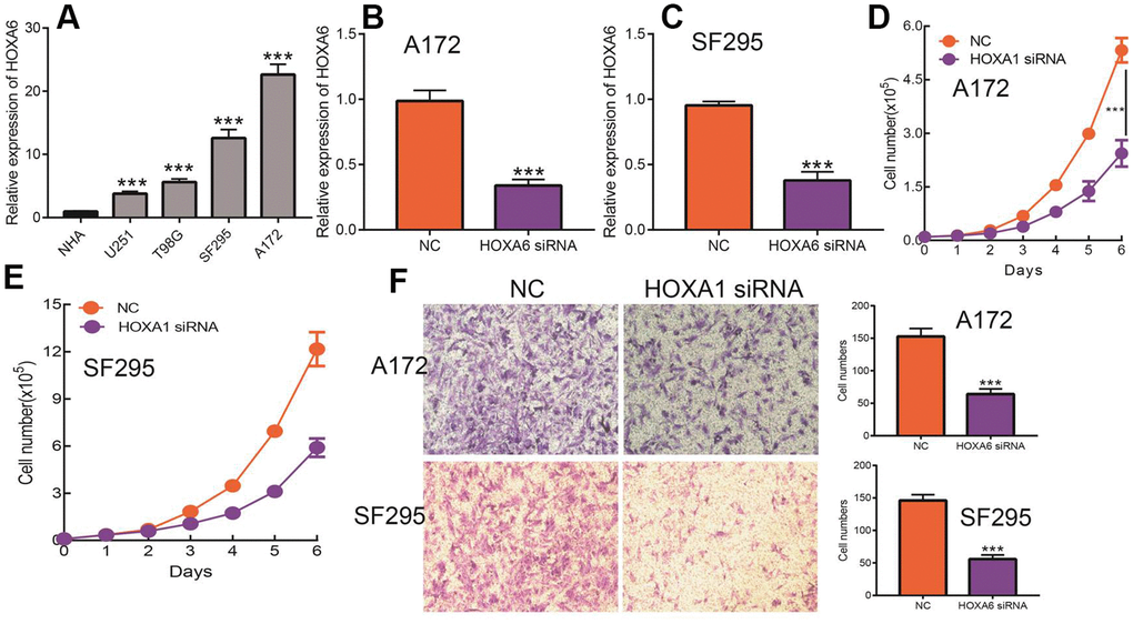 Given that HOXA1 expression was independent factors affecting the prognosis of LGG patients and previous no study reported the function of HOXA6 in LGG. Therefore, we decide explored function of HOXA6 in LGG. We first examined the expression of HOXA6 in LGG cells lines by qRT-PCR assay. The results confirmed that HOXA6 was up-regulated in LGG cells lines, especially in SF295 and A172 cells (Figure 15A). Next, we utilized siRNA knock down of HOXA6 in SF295 and A172 cells, the knock down efficiency was verify by qRT-PCR assay (Figure 15B, 15C). The growth curve assay showed that depletion of HOXA6 significantly inhibits LGG cells proliferation ability (Figure 15D, 15E). Furthermore, the transwell assay confirmed that HOXA6 knock down significantly inhibits LGG cells migration ability (Figure 15F). Collectively, these results demonstrate that HOXA6 was highly expressed in LGG cells lines and significantly affected their proliferation and migration abilities.