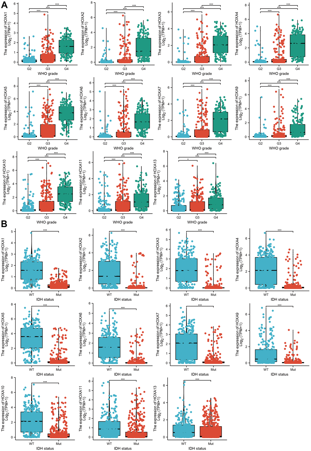 As a member of homeobox genes, the HOXA cluster genes family including the HOXA1 to HOXA7, HOXA9, HOXA10, HOXA11 and HOXA13 [3], The protein encoded by HOXA cluster genes family were contain the DNA-binding homeobox motif. Accumulating evidence demonstrated that HOXA genes family plays a central role in transcription regulation and cancer initiation and progression. For example, it has been showed that HOXA1 was highly expressed in breast cancer and its high expression was correlated with poor prognosis and tumor progression of BRCA [4]. Zheng et al. found that HOXA5 by inhibits the Wnt/β-catenin pathway and repress the proliferation and neoplasia of cervical cancer cells [5]. Furthermore, HOXA7 was increased in HCC. Depletion of HOXA7 by inhibits Snail expression and inhibits HCC metastatic [6]. Boman et al. found that elevate the expression of HOXA4 and HOXA9 promotes the self-renewal of colon cancer stem cell [7]. However, the expression profiles, genetic alterations, clinicopathological parameters, diagnosis values, prognostic values and immune functions of 11 HOXAs in low grade glioma remains to be further elucidated.