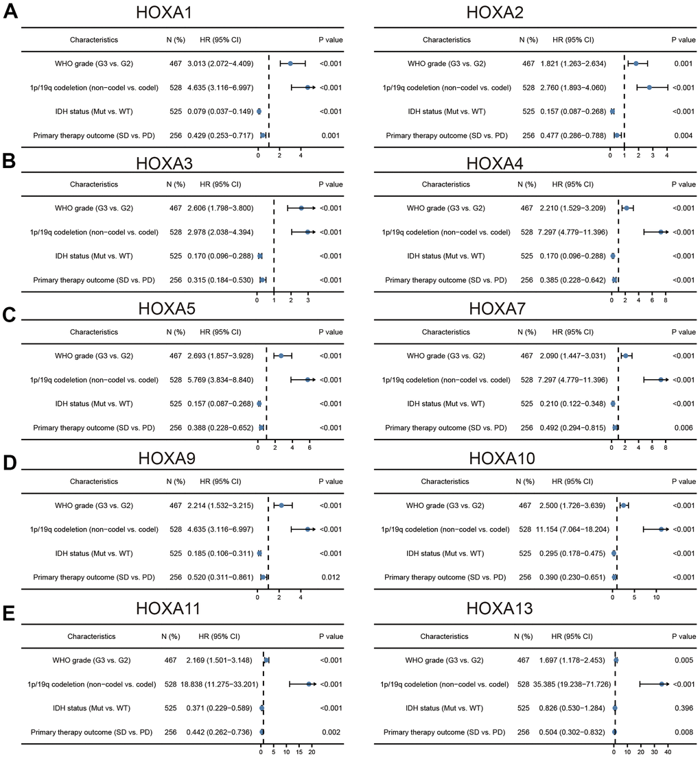 We further explored the correlation between HOXAs and clinical characteristics of LGG. The results showed that up-regulated 11 HOXAs were significantly associated with a higher tumor stage, IDH mutation status, 1p/19q chromosome co-deletion, histological type, primary therapy outcome, and age based on TCGA dataset (Figures 2, 3 and Supplementary Figure 1, Supplementary Table 1). This result was verified by CGGA database (Supplementary Figures 2, 3). The Logistic regression analysis of results also confirmed that HOXAs expression was remarkably associated with poor clinicopathological characteristics (Figure 4). Given that HOXAs were up-regulated in LGG and its higher expression associated with poor clinical characteristics. Therefore, we further explored the correlation among distinct HOXAs and the survival rate of LGG patients. The results indicated that higher expression of 11 HOXA was correlated with shorter overall survival (OS), disease-specific survival (DSS) and progression-free survival (PFS) in LGG patients (Figures 5–7). These results were verified by CGGA datasets (Supplementary Figure 4). Given that HOXAs differentially expression and associated with poor clinic-pathologic features and prognosis in LGG. The univariate cox proportional hazards regression analyses results confirmed that HOXA members (HOXA1, HOXA2, HOXA3, HOXA4, HOXA5, HOXA6, HOXA7, HOXA9, HOXA10 and HOXA11) expression and six clinical features (WHO grade, 1p/19q co-deletion, primary therapy outcome, IDH status, histological type and age) were correlated with adverse clinical outcomes of LGG patients. Additionally, the multivariate analyses revealed that HOXA1, HOXA6 expression and tumor grade, age, primary therapy outcome and age were independent factors affecting the prognosis of LGG patients (Table 1).