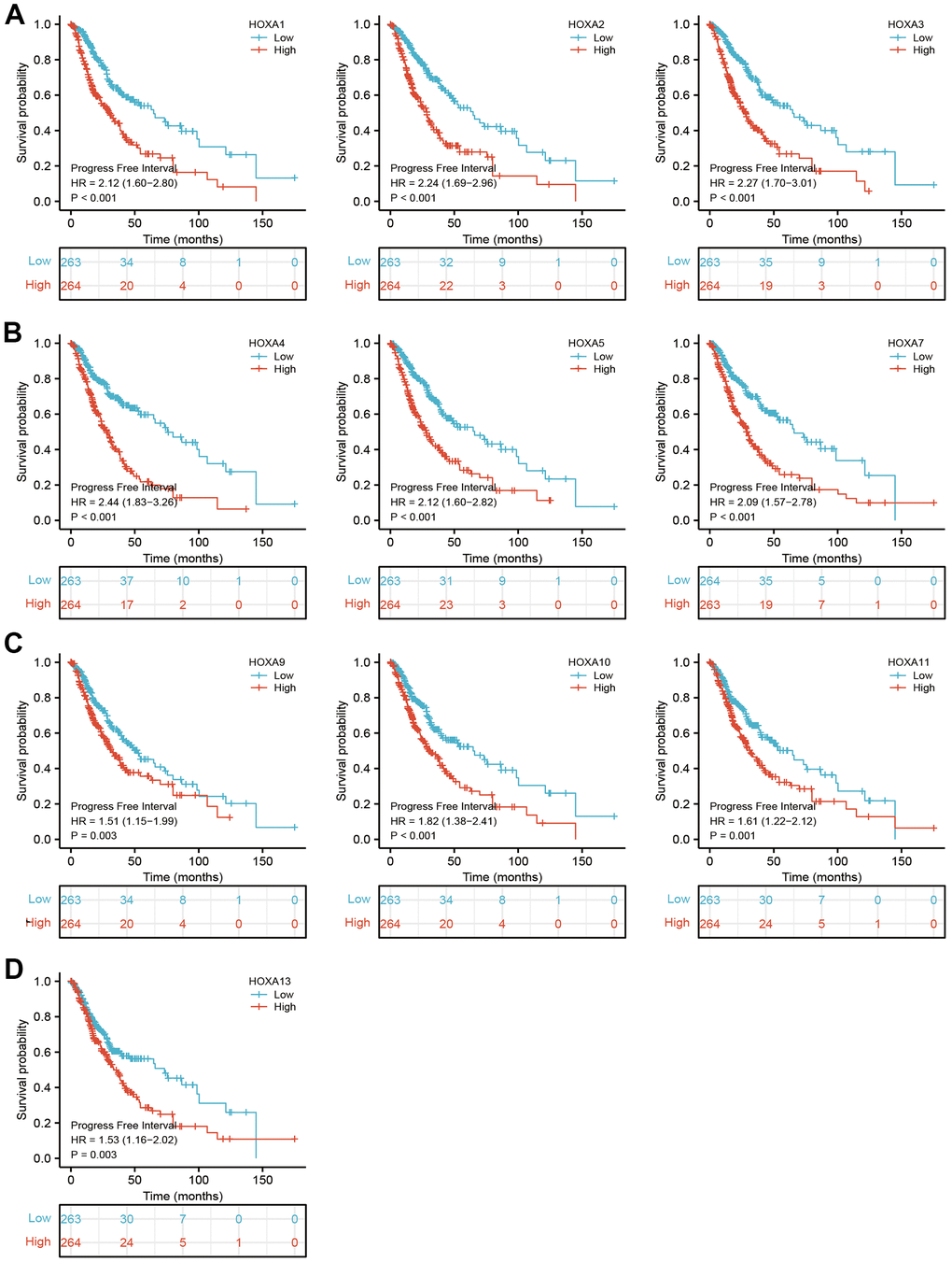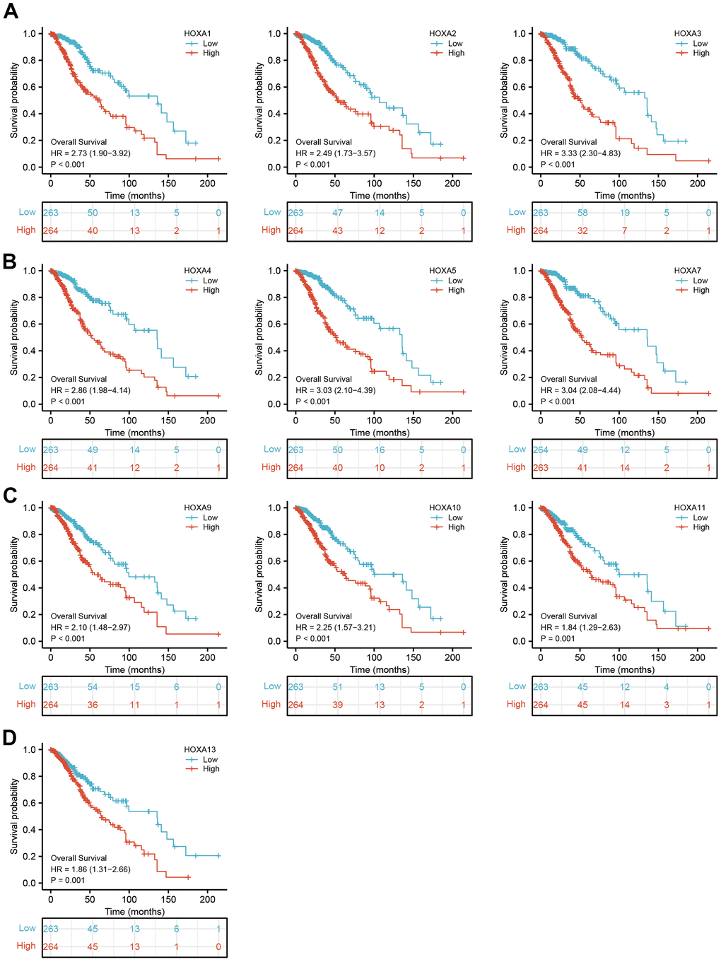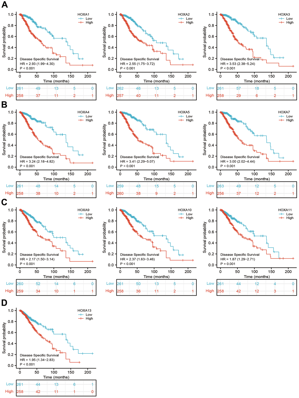 We utilized cox regression analysis to examine the correlation between HOXAs expression and overall survival and disease-specific survival of patients using the TCGA databases. The Kaplan-Meier method was used to assess the difference between high and low risk groups based on the best separation of HOXAs expression, employing R packages of survminer and survival.