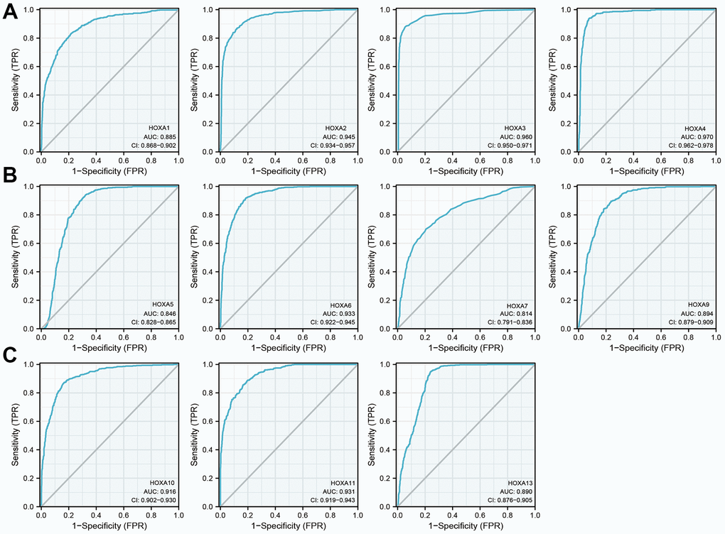 Given that HOXAs were significantly up-regulated in LGG and its higher expression was associated with adverse clinical features and adverse clinical outcomes. Therefore, we decided explored the diagnosis values of HOXAs in LGG. ROC curve analysis of HOXAs showed that HOXAs had a high accuracy (AUC > 0.80) in predicting LGG (Figure 8). These results confirmed that HOXAs has the potential to act as a diagnosis biomarker for the diagnosis of LGG with high sensitivity and specificity.
