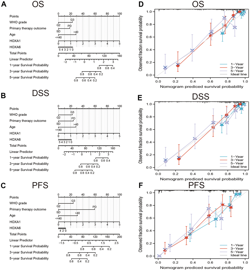 In order to provide clinicians with predicted prognosis of LGG patients quantitatively, we constructed the nomogram combining HOXA1, HOXA6 expression and independent clinical risk factors (tumor grade, age, primary therapy outcome and age). Higher total points on the nomogram for overall survival (OS), disease-specific survival (DSS) and progression-free survival (PFS), respectively, indicated a worse prognosis (Figure 9). In summary, these results indicate that the nomogram can well predict short- or long-term survival of LGG patients.