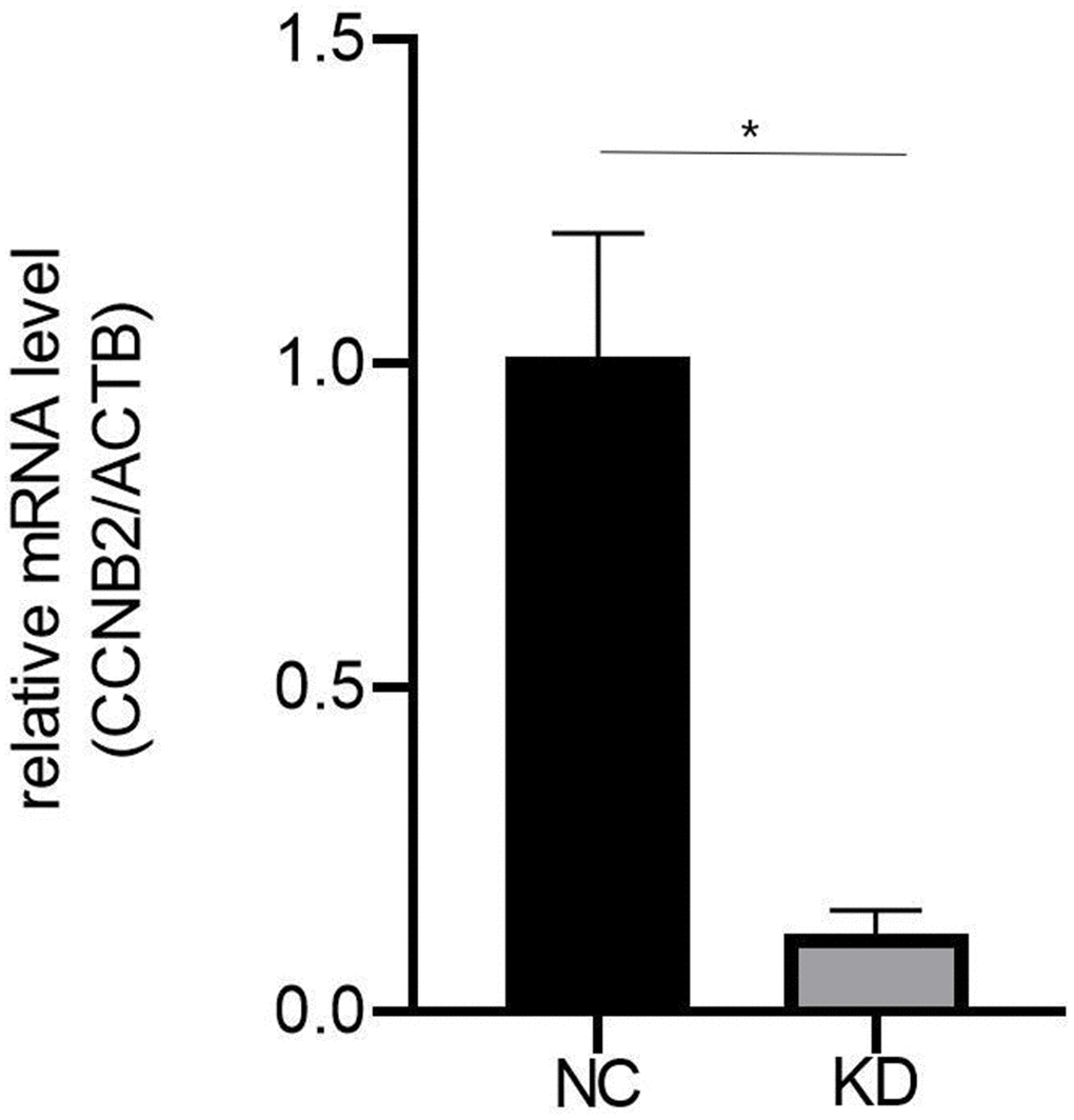As shown in Figure 1, the expression level of CCNB2 was considerably reduced in Huh-7 cells transfected with CCNB2 siRNA as determined by qPCR (KD 0.121 ± 0.036 vs. NC 1.012 ± 0.190; p < 0.01), and the interference efficiency of the KD group was 87.9%.
