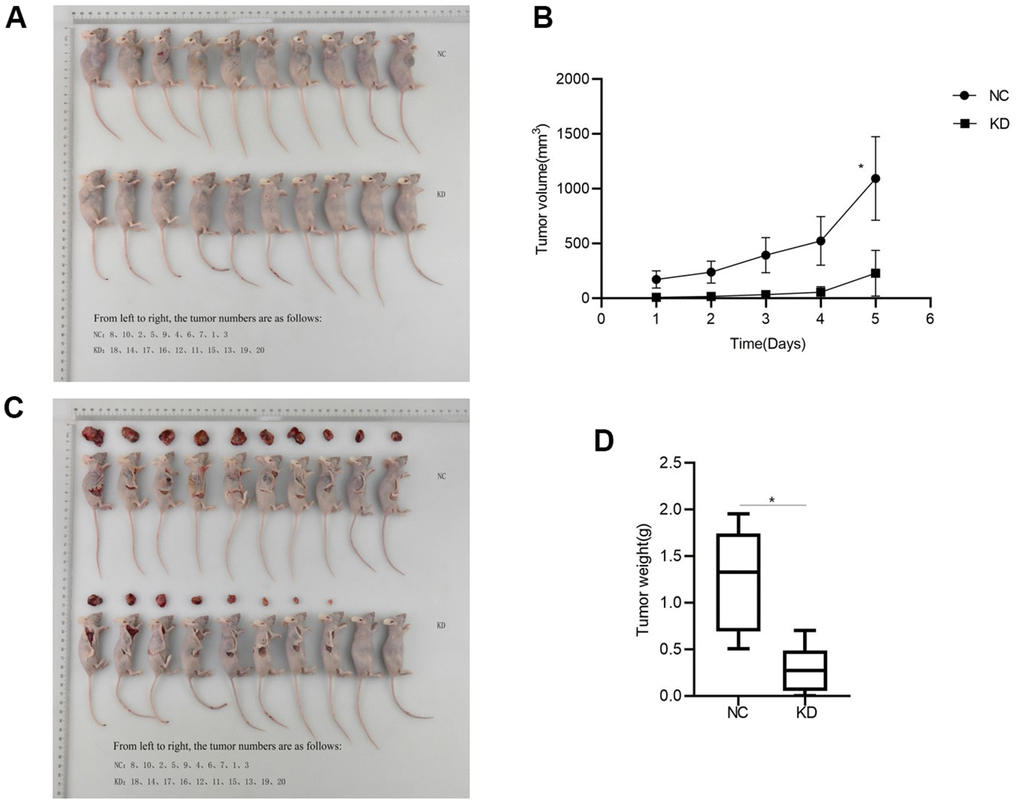 Huh-7 cells with CCNB2 knockdown and Huh-7 cells without CCNB2 knockdown were injected subcutaneously into the experimental group (KD group) and the control group (NC group), respectively, to observe tumour formation. After 25 days, eight nude mice in the experimental group developed tumours, and the tumour formation rate of this group was 80%. All nude mice in the control group developed tumours, and the tumour formation rate of this group was 100% (Figure 2A). These results suggest that CCNB2 knockdown could reduce the tumour formation rate in nude mice and may inhibit the occurrence of HCC.