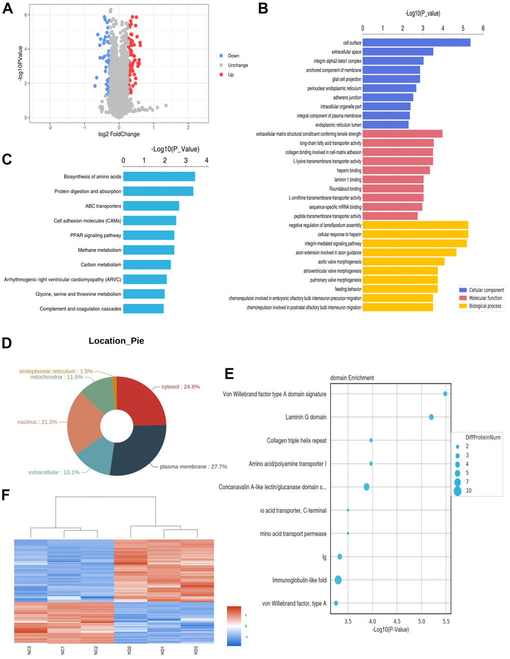 The results of domain annotation and enrichment analysis indicated that the differential protein domains were enriched in Von Willebrand factor type A domain signature, laminin G domain, collagen triple helix repeat, amino acid/polyamine transporter I and concanavalin A-like lectin (Figure 3E).