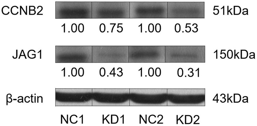 Total protein extraction was performed using RIPA lysate (Beyotime, Shanghai, China), and SDS-PAGE was then performed. The protein was transferred to a PVDF membrane using an electrical transfer device (Shanghai TANON Technology Co., Ltd., China). After blocking the membrane, it was incubated with primary antibody and secondary antibody successively. The following primary antibodies were used: rabbit anti-human CCNB2 antibody (Abcam, USA) and rabbit anti-human JAG1 antibody (CST, USA). X-ray imaging was performed using the CST 20X Lumiglo® Reagent and 20X spectroscopy #7003 kit (CST). The relative optical densities of all bands were quantified by GelPro Analyzer (Media Cybernetics, Silver Spring, MD, USA). All results were normalized to the internal standard (β-actin) [14].